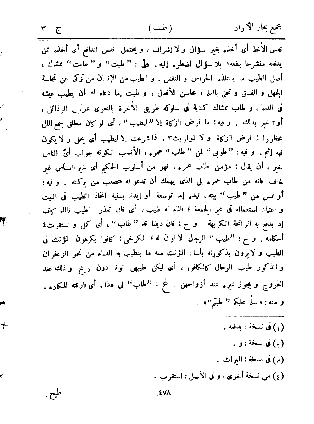 نفس الأخذ أي أخذه بغير سؤال ولا إشراف، ويحتمل نفس الدافع أي أخذه ممن يدفعه منشرحًا بنفعه بلا سؤال اضطره إليه. ط: "طبت" و"طابت" ممشاك، أصل الطيب ما يستلذه الحواس والنفس، والطيب من الإنسان من تزكى عن نجاسة الجهل والفسق وتحلى بالعلم ومحاسن الأفعال، وطبت إما دعاه له بأن يطيب عيشه في الدنيا، وطاب ممشاك كناية في سلوكه طريق الآخرة بالتعري عن الرذائل، أو خبر بذلك. وفيه: ما فرض الزكاة إلا "ليطيب"، أي لو كان مطلق جمع المال محظورًا لما فرض الزكاة ولا المواريث، فما شرعت إلا ليطيب أي يحل ولا يكون فيه إثم. وفيه: "طوبى" لمن "طاب" عمره، الأنسب لكونه جواب أي الناس خير، أن يقال: مؤمن طاب عمره، فهو من أسلوب الحكيم أي خير الناس غير خاف فإنه من طاب عمره بل الذي يهمك أن تدعو له فتصيب من بركته. وفيه: أو يمس من "طيب" بيته، قيده إما توسعة أو إيذانًا بسنية اتخاذ الطيب في البيت واعتياد استعماله في غير الجمعة؛ فالماء له طيب، أي فإن تعذر الطيب فالماء كاف إذ يدفع به الرائحة الكريهة. وح: فإن ديننا قد "طاب"، أي كمل واستقرت أحكامه. وح: "طيب" الرجال لا لون له؛ الكرخى: كانوا يكرهون المؤنث في الطيب ولا يرون بذكورته بأسًا، المؤنث منه ما يتطيب به النساء من نحو الزعفران والذكور طيب الرجال كالكافور، أي ليكن طيبهن لونًا دون ريح وذلك عند الخروج ويجوز غيره عند أزواجهن. غ: "طاب" لي هذا، أي فارقته المكاره. ومنه: "سلم عليكم "طبتم"".