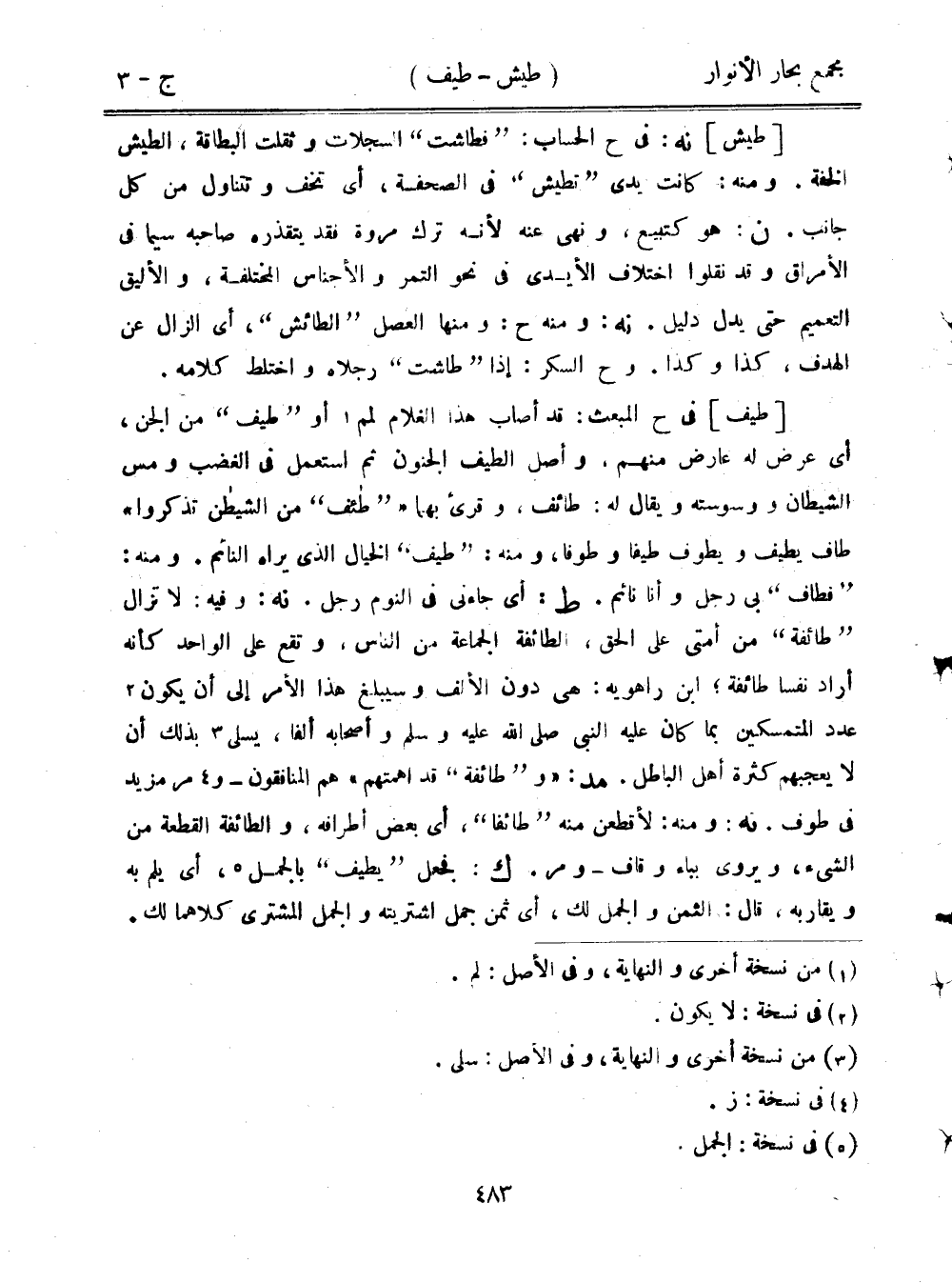 [طيف] في ح المبعث: قد أصاب هذا الغلام لمم أو "طيف" من الجن، أي عرض له عارض منهم، وأصل الطيف الجنون ثم استعمل في الغضب ومس الشيطان ووسوسته ويقال له: طائف، وقرئ بهما ""طئف" من الشيطان تذكروا" طاف يطيف ويطوف طيفًا وطوفًا، ومنه: "طيف" الخيال الذي يراه النائم. ومنه: "فطاف" بي رجل وأنا نائم. ط: أي جاءني في النوم رجل. نه: وفيه: لا تزال "طائفة" من أمتي على الحق، الطائفة الجماعة من الناس، وتقع على الواحد كأنه أراد نفسا طائفة؛ ابن راهويه: هي دون الألف وسيبلغ هذا الأمر إلى أن يكون عدد المتمسكين بما كان عليه النبي صلى الله عليه وسلم وأصحابه ألفا، يسلي بذلك أن لا يعجبهم كثرة أهل الباطل. مد: "و"طائفة" قد أهمتهم" هم المنافقون- ومر مزيد في طوف. نه: ومنه: لأقطعن منه "طائفا"، أي بعض أطرافه، والطائفة القطعة من الشيء، ويروى بباء وقاف- ومر. ك: فجعل "يطيف" بالجمل، أي يلم به ويقاربه، قال: الثمن والجمل لك، أي ثمن جمل اشتريته والجمل المشتري كلاهما لك.