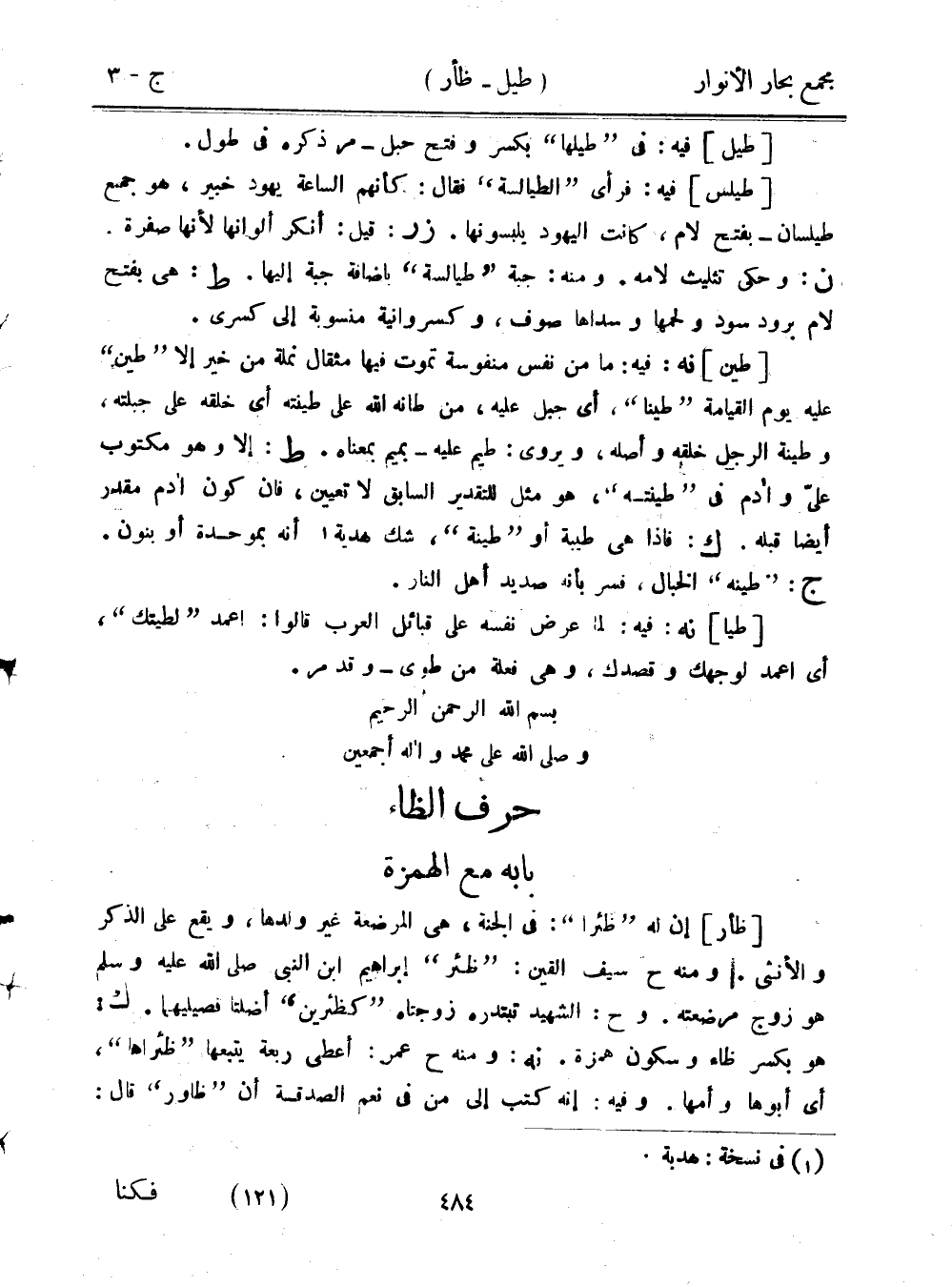 [طيلس] فيه: فرأى "الطيالسة" فقال: كأنهم الساعة يهود خبير، هو جمع طيلسان- بفتح لام، كانت اليهود يلبسونها. زر: قيل: أنكر ألوانها لأنها صفرة. ن: وحكى تثليث لامه. ومنه: جبة "طيالسة" بإضافة جبة إليها. ط: هي بفتح لام برود سود ولحمها وسداها صوف، وكسروانية منسوبة على كسرى.