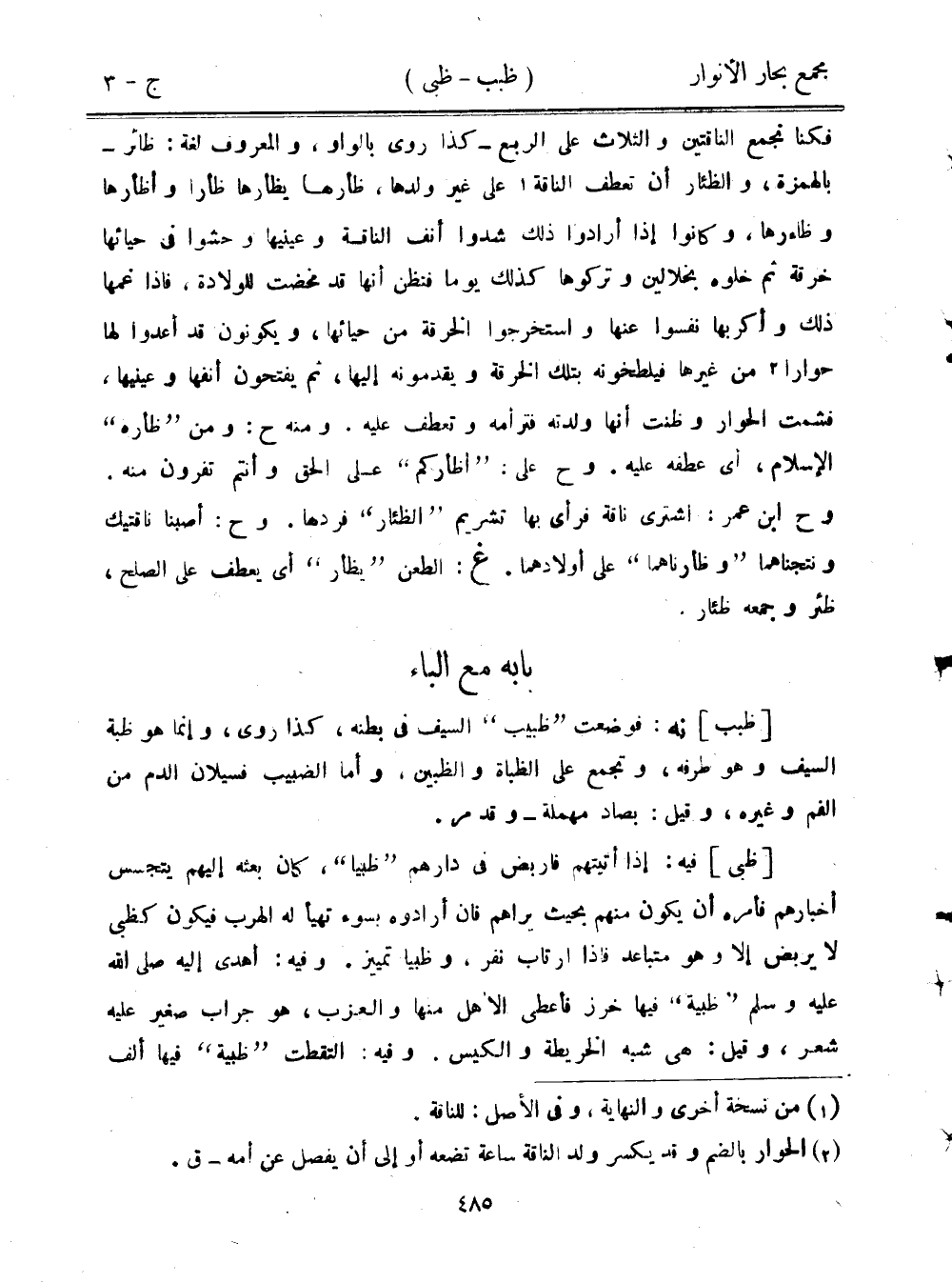 فكنا نجمع الناقتين والثلاث على الربع- كذا روى بالواو، والمعروف لغة: ظائر- بالهمزة، والظئار أن تعطف الناقة على غير ولدها، ظأرها يظأرها ظأرا وأظأرها وظاءرها، وكانوا إذا أرادوا ذلك شدوا أنف الناقة وعينيها وحشوا في حيائها خرقة ثم خلوه بخلالين وتركوها كذلك يومًا فتظن أنها قد مخضت للولادة، فإذا غمها ذلك وأكربها نفسوا عنها وستخرجوا الخرقة من حيائها، ويكونون قد أعدوا لها حوارًا من غيرها فيلطخونه بتلك الخرقة ويقدمونه إليها، ثم يفتحون أنفها وعينيها، فشمت الحوار وظنت أنها ولدته فترأمه وتعطف عليه. ومنه ح: ومن "ظأره" الإسلام، أي عطفه عليه. وح على: "أظأركم" على الحق وأنتم تفرون منه. وح ابن عمر: اشترى ناقة فرأى بها تشريم "الظئار" فردها. وح: أصبنا ناقتيك ونتجناهما "وظأرناهما" على أولادهما. غ: الطعن "يظأر" أي يعطف على الصلح، ظئر وجمعه ظئار.