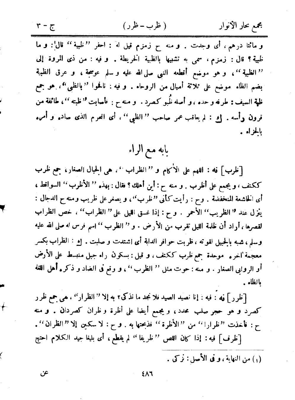 [ظرر] نه: فيه: إنا نصيد الصيد فلا نجد ما نذكي به إلا "الظرار"، هي جمع ظرر كصرد وهو حجر صلب محدد، ويجمع أيضًا على أظرة وظران كصردان. ومنه ح: فأخذت "ظرارًا" من "الأظرة" فذبحتها به. وح: لا سكين إلا "الظران".