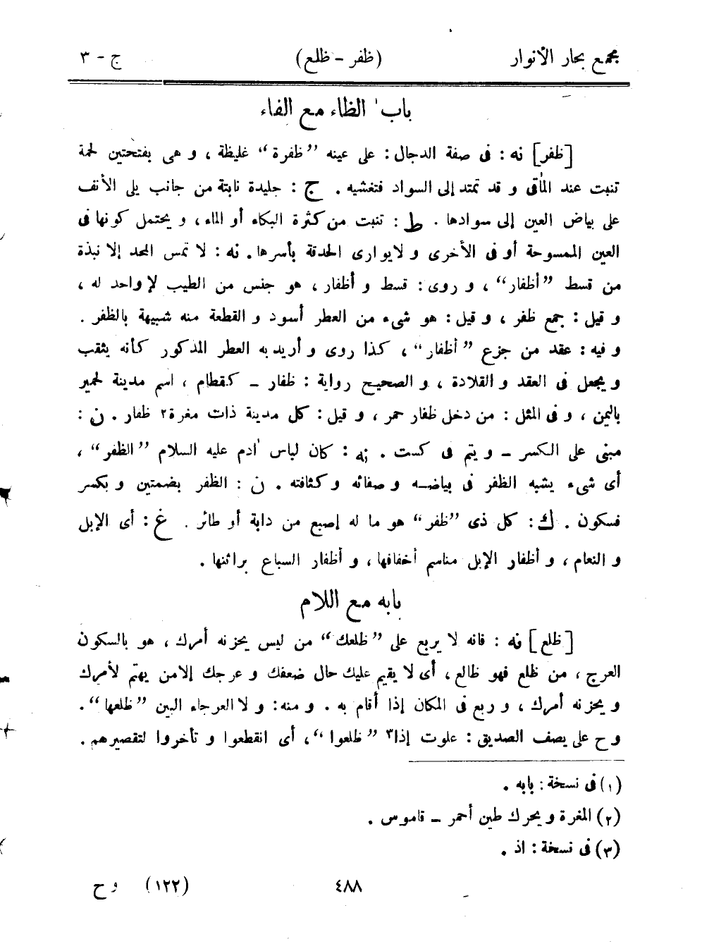 [ظفر] نه: في صفة الدجال: على عينه "ظفرة" غليظة، وهي بفتحتين لحمة تنبت عند المآقي وقد تمتد إلى السواد فتغشيه. ج: جليدة نابتة من جانب يلي الأنف على بياض العين إلى سوادها. ط: تنبت من كثرة البكاء أو الماء، ويحتمل كونها في العين الممسوحة أو في الأخرى ولا يواري الحدقة بأسرها. نه: لا تمس المحد إلا نبذة من قسط "أظفار"، وروى: قسط وأظفار، هو جنس من الطيب لا واحد له، وقيل: جمع ظفر، وقيل: هو شيء من العطر أسود والقطعة منه شبيهة بالظفر. وفيه: عقد من جزع "أظفار"، كذا روى وأريد به العطر المذكور كأنه يثقب ويجعل في العقد والقلادة، والصحيح رواية: ظفار- كقطام، اسم مدينة لحمير باليمن، وفي المثل: من دخل ظفار حمر، وقيل: كل مدينة ذات مغرة ظفار. ن: مبني على الكسر- ويتم في كست. نه: كان لباس آدم عليه السلام "الظفر"، أي شيء يشبه الظفر في بياضه وصفائه وكثافته. ن: الظفر بضمتين وبكسر فسكون. ك: كل ذي "ظفر" هو ما له إصبع من دابة أو طائر. غ: أي الإبل والنعام، وأظفار الإبل مناسم أخفافها، وأظفار السباع براثنها.