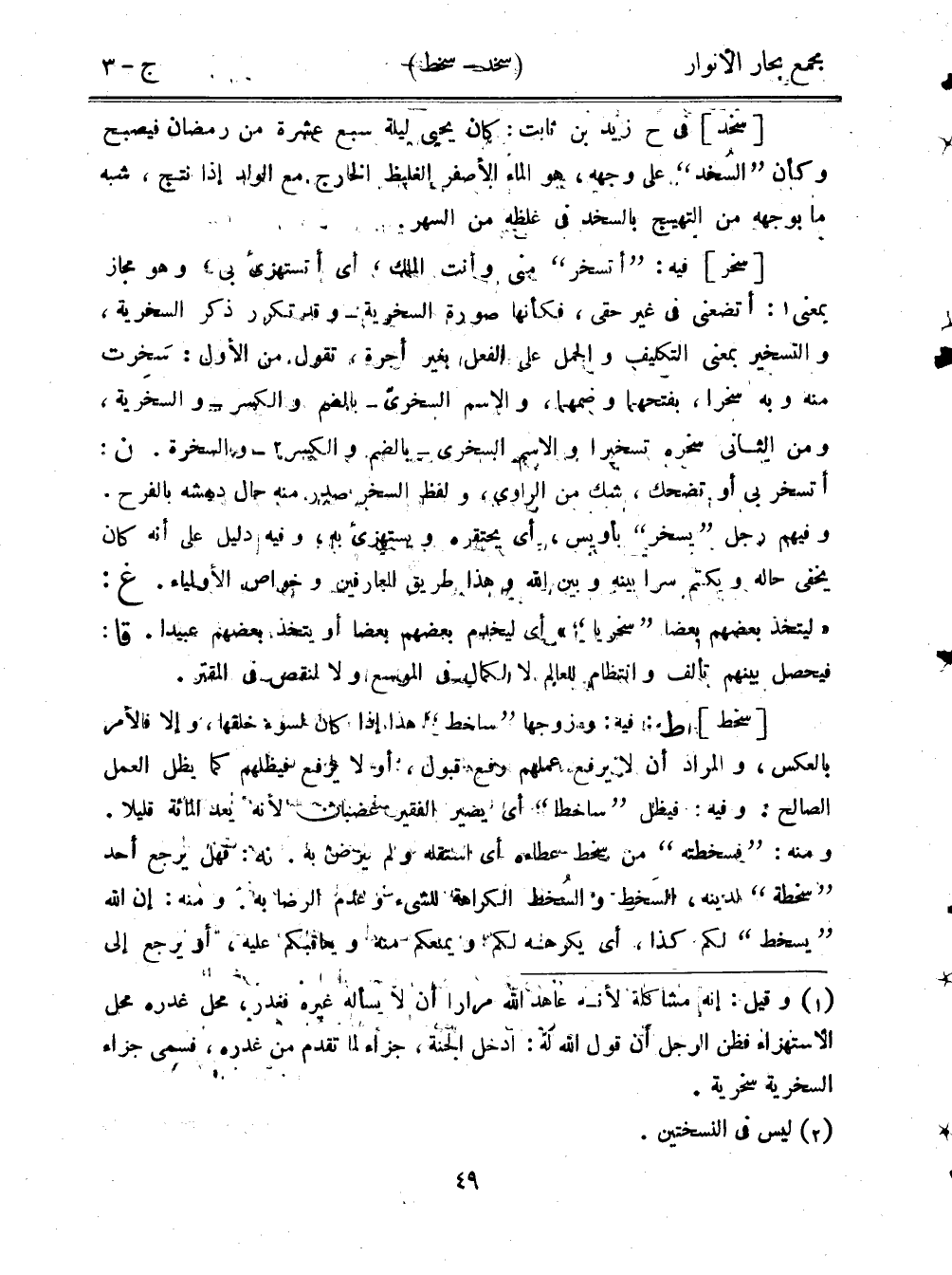 [سخر] فيه: "أتسخر" مني وأنت الملك، أي أتستهزئ بي، وهو مجاز بمعنى: أتضعني في غير حقي، فكأنها صورة السخرية - وقد تكرر ذكر السخرية، والتسخير بمعنى التكليف والحمل على الفعل بغير أجرة، تقول من الأول: سخرت منه وبه سخرًا، بفتحهما وضمهما، والاسم السخري - بالضم والكسر - والسخرية، ومن الثاني سخره تسخيرًا والاسم السخري - بالضم والكسر - والسخرة. ن: أتسخر بي أو تضحك، شك من الراوي، ولفظ السخر صدر منه حال دهشة بالفرح. وفيهم رجل "يسخر" بأويس، أي يحتقره ويستهزئ به، وفيه دليل على أنه كان يخفي حاله ويكتم سرًا بينه وبين الله وهذا طريق المعارفين وخواص الأولياء. غ: "ليتخذ بعضهم بعضًا "سخريًا" أي ليخدم بعضهم بعضًا أو يتخذ بعضهم عبيدًا. قا: فيحصل بينهم تألف وانتظام للعالم لا الكمال في الموسع ولا لنقص في المقتر.