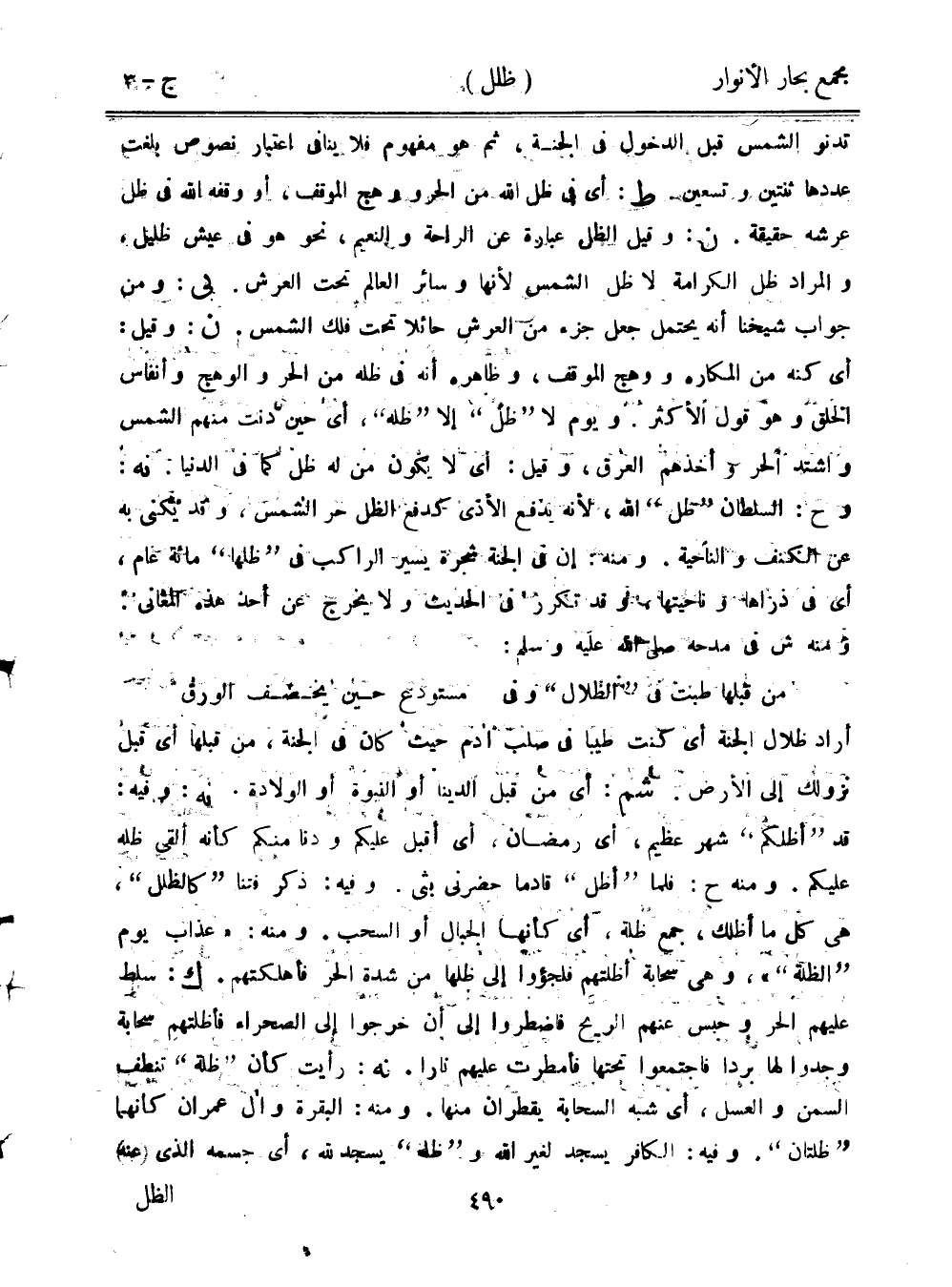 من قبلها طبت في "الظلال" وفي مستودع حين يخصف الورق أراد ظلال الجنة أي كنت طيبًا في صلب آدم حيث كان في الجنة، من قبلها أي قبل نزولك إلى الأرض. شم: أي من قبل الدينا أو النبوة أو الولادة. نه: وفيه: قد "أظلكم" شهر عظيم، أي رمضان، أي أقبل عليكم ودنا منكم كأنه ألقى ظله عليكم. ومنه ح: فلما "أظل" قادمًا حضرني بثي. وفيه: ذكر فتنا "كالظلل"، هي كل ما أظلك، جمع ظلة، أي كأنها الجبال أو السحب. ومنه: "عذاب يوم "الطلة""، وهي سحابة أظلتهم فلجؤوا إلى ظلها من شدة الحر فأهلكتهم. ك: سلط عليهم الحر وحبس عنهم الريح فاضطروا إلى أن خرجوا إلى الصحراء فأظلتهم سحابة وجدوا لها بردًا فاجتمعوا تحتها فأمطرت عليهم نارًا. نه: رأيت كأن "ظلة" تنظف السمن والعسل، أي شبه السحابة يقطران منها. ومنه: البقرة وآل عمران كأنهما "ظلتان". وفيه: الكافر يسجد لغير الله و"ظله" يسجد لله، أي جسمه الذي (عنه)