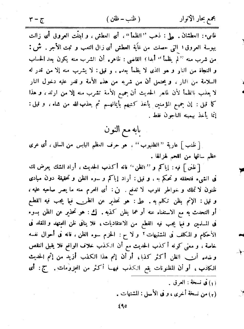 [ظنن] فيه: إياكم و"الظن" فإنه أكذب الحديث، أراد الشك يعرض لك في الشيء فتحققه وتحكم به، وقيل: أراد إياكم وسوء الظن وتحقيقه دون مبادي ظنون لا تملك وخواطر قلوب لا تدفع. ن: أي المحرم منه ما يصر صاحبه عليه، وقيل: الإثم بظن تكلم به. ط: هو تحذير عن الظن فيما يجب فيه القطع أو التحدث به مع الاستغناء عنه أو عما يظن كذبه. ك: هو تحذير عن الظن بسوء في المسلمين وفيما يجب فيه القطع من الاعتقاديات، فلا ينافي ظن المجتهد والمقلد في الأحكام والمكلف في المشتبهات ولا ح: الحزم سوء الظن، فإنه في أحوال نفسه خاصة، ومعنى كونه أكذب الحديث مع أن الكذب خلاف الواقع فلا يقبل النقص وضده أن الظن أكثر كذبًا، أو أن إثم هذا الكذب أزيد من إثم الحديث الكاذب، أو أن المظنونات يقع الكذب فيها أكثر من المجزومات. ج: أي