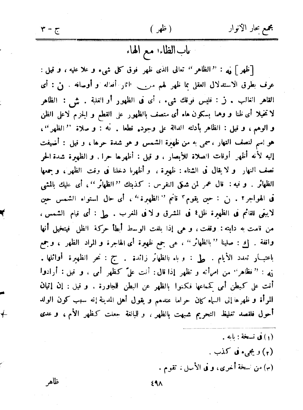 [ظهر] نه: "الظاهر" تعالى الذي ظهر فوق كل شيء وعلا عليه، وقيل: عرف بطرق الاستدلال العقلي بما ظهر لهم من آثار أفعاله وأوصافه. ن: أي القاهر الغالب. ز: فليس فوقك شيء، أي في الظهور أو الغلبة. ش: الظاهر لا تخيلًا أي ظنًا ووهمًا بسكون هاء أي متصف بالظهور على القطع والجزم لا على الظن والوهم، وقيل: الظاهر بأدلته الدالة على وجوده قطعًا. نه: وصلاة "الظهر"، هو اسم لنصف النهار، سمي به من ظهيرة الشمس وهو شدة حرها، وقيل: أضيفت إليه لأنه أظهر أوقات الصلاة للأبصار، وقيل: أظهرها حرًا، والظهيرة شدة الحر نصف النهار ولا يقال في الشتاء: ظهيرة، وأظهرنا دخلنا في وقت الظهر، وجمعها الظهائر. وفيه: قال عمر لمن شكى النقرس: كذبتك "الظهائر"، أي عليك بالمشي في الهواجر. ن: حين يقوم قائم "الظهيرة"، أي حال استواء الشمس حين لا يبقى للقائم في الظهيرة ظل في المشرق ولا في المغرب. ط: أي قيام الشمس، من قامت به دابته: وقفت، وهي إذا بلغت الوسط أبطأ حركة الظل فيتخيل أنها واقفة. ك: صلينا "بالظهائر"، هي جمع ظهيرة أي الهاجرة والمراد الظهر، وجمع باعتبار تعدد الأيام. ط: وباء بالظهائر زائدة. ج: نحر الظهيرة أوائلها. نه: "فظاهر" من امرأته وتظهر إذا قال: أنت علي كظهر أمي، وقيل: أرادوا أنت علي كبطن أمي كجماعها فكنوا بالظهر عن البطن للمجاورة، وقيل: إن إتيان المرأة وظهرها إلى السماء كان حرامًا عندهم ويقول أهل المدينة إنه سبب كون الولد أحول فلقصد تغليظ التحريم شبهت بالظهر، وللمبالغة جعلت كظهر الأم، وعدى
