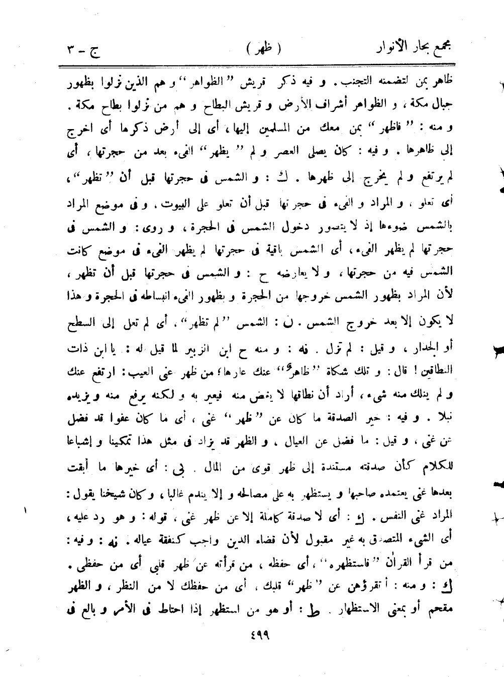 ظاهر بمن لتضمنه التجنب. وفيه ذكر قريش "الظواهر" وهم الذين نزلوا بظهور جبال مكة، والظواهر أشراف الأرض وقريش البطاح وهم من نزلوا بطاح مكة. ومنه: "فاظهر" بمن معك من المسلمين إليها، أي إلى أرض ذكرها أي اخرج إلى ظاهرها. وفيه: كان يصلي العصر ولم "يظهر" الفيء بعد من حجرتها، أي لم يرتفع ولم يخرج إلى ظهرها. ك: والشمس في حجرتها قبل أن "تظهر"، أي تعلو، والمراد والفيء في حجرتها قبل أن تعلو على البيوت، وفي موضع المراد بالشمس ضوءها إذ لا يتصور دخول الشمس في الحجرة، وروى: والشمس في حجرتها لم يظهر الفيء، أي الشمس باقية في حجرتها لم يظهر الفيء في موضع كانت الشمس فيه من حجرتها، ولا يعارضه ح: والشمس في حجرتها قبل أن تظهر، لأن المراد بظهور الشمس خروجها من الحجرة وبظهور الفيء انبساطه في الحجرة وهذا لا يكون إلا بعد خروج الشمس. ن: الشمس "لم تظهر"، أي لم تعل إلى السطح أو الجدار، وقيل: لم تزل. نه: ومنه ح ابن الزبير لما قيل له: يا ابن ذات النطاقين! قال: وتلك شكاة "ظاهر" عنك عارها؛ من ظهر عني العيب: ارتفع عنك ولم ينلك منه شيء، أراد أن نطاقها لا يغض منه فيعير به ولكنه يرفع منه ويزيده نبلًا. وفيه: خير الصدقة ما كان عن "ظهر" غنى، أي ما كان عفوا قد فضل عن غنى، وقيل: ما فضل عن العيال، والظهر قد يزاد في مثل هذا تمكينًا وإشباعًا للكلام كأن صدقته مستندة إلى ظهر قوي من المال. بي: أي خيرها ما أبقت بعدها غنى يعتمده صاحبها ويستظهر به على مصالحه وإلا يندم غالبًا، وكان شيخنا يقول: المراد غنى النفس. ك: أي لا صدقة كاملة إلا عن ظهر غنى، قوله: وهو رد عليه، أي الشيء المتصدق به غير مقبول لأن قضاء الدين واجب كنفقة عياله. نه: وفيه: من قرأ القرآن "فاستظهره"، أي حفظه، من قرأته عن ظهر قلبي أي من حفظي. ك: ومنه: أتقرؤهن عن "ظهر" قلبك، أي من حفظك لا من النظر، والظهر مقحم أو بمعنى الاستظهار. ط: أو هو من استظهر إذا احتاط في الأمر وبالغ في