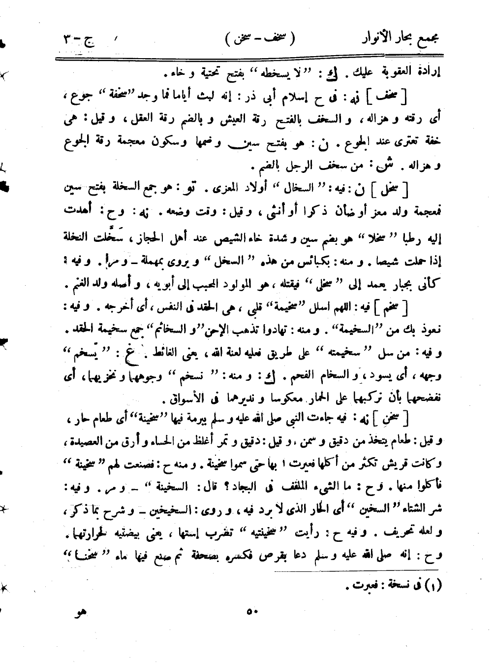 [سخن] نه: فيه جاءت النبي صلى الله عليه وسلم ببرمة فيها "سخينة" أي طعام حار، وقيل: طعام يتخذ من دقيق وسمن، وقيل: دقيق وتمر أغلظ من الحساء وأرق من العصيدة، وكانت قريش تكثر من أكلها فعيرت بها حتى سموا سخينة. ومنه ح: فصنعت لهم "سخينة" فأكلوا منها. وح: ما الشيء الملفف في البجاد؟ قال: السخينة" - ومر. وفيه: شر الشتاء "السخين" أي الحار الذي لا برد فيه، وروى: السخيخين - وشرح بما ذكرن ولعله تحريف. وفيه ح: رأيت "سخينتيه" تضرب إستها، يعني بيضتيه لحرارتهما. وح: إنه صلى الله عليه وسلم دعا بقرص فكسره بصحفة ثم صنع فيها ماء "سخنا"