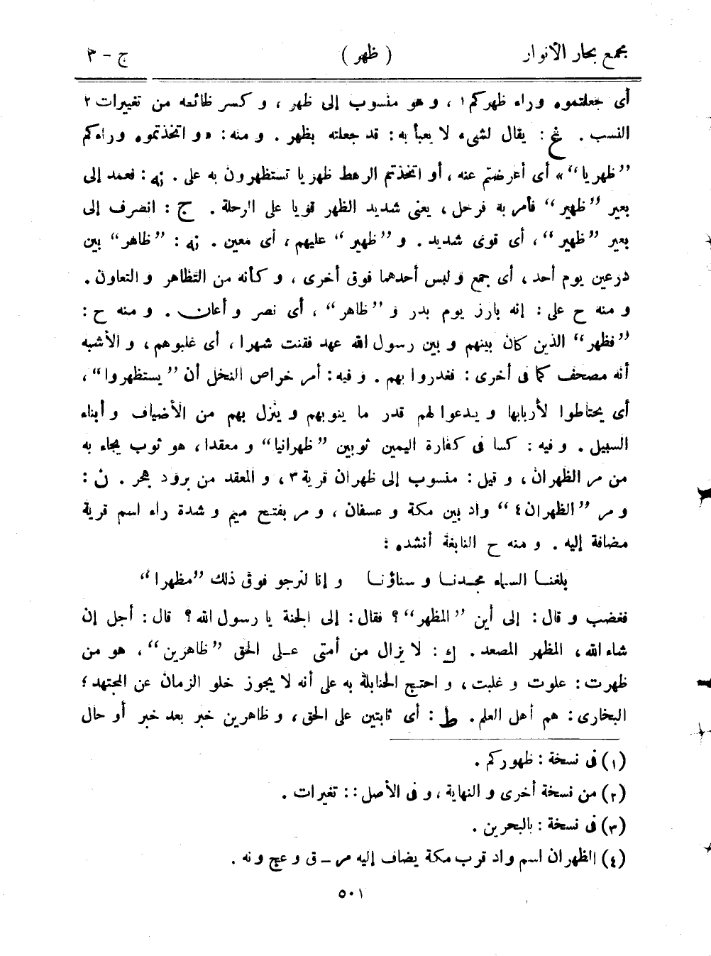 أي جعلتموه وراء ظهركم، وهو منسوب إلى ظهر، وكسر ظائه من تغييرات النسب. غ: يقال لشيء لا يعبأ به: قد جعلته بظهر. ومنه: "واتخذتموه وراءكم "ظهريًا"" أي أعرضتم عنه، أو اتخذتم الرهط ظهريًا تستظهرون به على. نه: فعمد إلى بعير "ظهير" فأمر به فرحل، يعني شديد الظهر قويًا على الرحلة. ج: انصرف إلى بعير "ظهير"، أي قوي شديد. و"ظهير" عليهم، أي معين. نه: "ظاهر" بين درعين يوم أحد، أي جمع ولبس أحدهما فوق أخرى، وكأنه من التظاهر والتعاون. ومنه ح على: إنه بارز يوم بدر و"ظاهر"، أي نصر وأعان. ومنه ح: "فظهر" الذين كان بينهم وبين رسول الله عهد فقنت شهرًا، أي غلبوهم، والأشبه أنه مصحف كما في أخرى: فغدروا بهم. وفيه: أمر خراص النخل أن "يستظهروا"، أي يحتاطوا لأربابها ويدعوا لهم قدر ما ينوبهم وينزل بهم من الأضياف وأبناء السبيل. وفيه: كسا في كفارة اليمين ثوبين "ظهرانيا" ومعقدًا، هو ثوب يجاء به من مر الظهران، وقيل: منسوب إلى ظهران قرية، والمعقد من برود هجر. ن: ومر "الظهران" واد بين مكة وعسفان، ومر بفتح ميم وشدة راء اسم قرية مضافة إليه. ومنه ح النابغة أنشده: