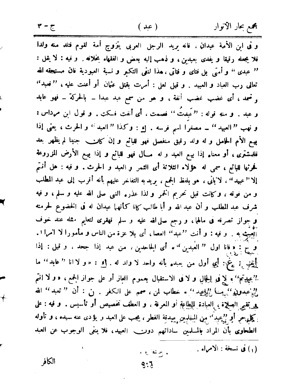 وفي ابن الأمة عبدان، فإنه يريد الرجل العربي يتزوج أمة لقوم فتلد منه ولدًا فلا يجعله رقيقًا ويفدى بعبدين، وذهب إليه بعض والفقهاء بخلافه. وفيه: لا يقل: "عبدي" وأمتي بل فتاي وفتاتي، هذا لنفي التكبر ونسبة العبودية فإن مستحقه الله تعالى رب العباد والعبيد. وقيل لعلي: أمرت بقتل عثمان أو أعنت عليه، "فعبد" وضمد، أي غضب غضب أنفة، وهو من سمع عبد عبدًا- بالحركة- فهو عابد وعبد. ومنه قوله: "عبدت" فصمت، أي أنفت فسكت. وقول ابن مرداس: ونهب "العبيد"- مصغرًا اسم فرسه. ك: وكذا "العبد" والحرث، يعني إذا بيع الأم الحامل وله ولد رقيق منفصل فهو للبائع وإن كان جنينًا لم يظهر بعد فللمشتري، أو معناه إذا بيع العبد وله مال فهو للبائع وإذا بيع الأرض المزروعة فحرثها للبائع، سمي له هؤلاء الثلاثة أي الثمر والعبد والحرث. وفيه: هل أنتم إلا "عبيد"، لا يأتي، هو بلفظ الجمع، يريد به التفاخر عليهم بأنه أقرب إلى عبد المطلب ومن فوقه، وكانت قبل تحريم الخمر ولذا عذره النبي صلى الله عليه وسلم، وفيه شرف عبد المطلب وأن عبد الله وأبا طالب كانا كأنهما عبدان له في الخضوع لحرمته وجواز تصرفه في مالهما، ورجع صلى الله عليه وسلم قهقري لتعليم مثله عند خوف العبث به. وفيه: وأنت "عبد" العصا، أي بلا عزة من الناس ومأمورًا لا آمرًا. وح: "فأنا أول "العبدين"" أي الجاحدين، من عبد إذا جحد، وقيل: إذا أنف، غ: أي أول من يعبده بأنه واحد لا ولد له. ك: "ولا أنا "عابد" ما "عبدتم"، لا في الحال ولا في الاستقبال بعموم المجاز أو على جواز الجمع، "ولا أنتم "عابدون" ما "أعبد"" خطاب لمن، صمم على الكفر. ن: أن "تعبد" الله وتقيم الصلاة، العبادة الطاعة أو المعرفة، والعطف تخصيص أو تأسيس. وفيه: على كل حر أو "عبد" من المسلمين صدقة الفطر، يجب على العبد ويؤدي عنه سيده، وتأوله الطحاوي بأن المراد بالمسلمين ساداتهم دون العبيد، فلا ينفي الوجوب عن العبد