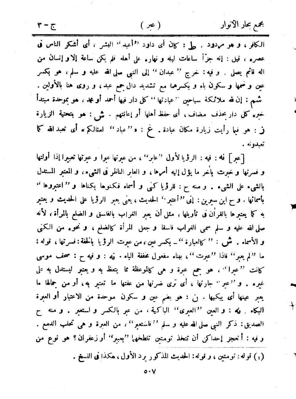 [عبر] نه: فيه: الرؤيا لأول "عابر"، من عبرتها عبرًا وعبرتها تعبيرًا إذا أولتها وفسرتها وخبرت بآخر ما يؤل إليه أمرها، والعابر الناظر في الشيء، والمعتبر المستدل بالشيء على الشيء. ومنه ح: للرؤيا كني وأسماء فكنوها بكناها و"اعتبروها" بأسمائها. وح ابن سيرين: إني "أعتبر" الحديث، يعني يعبر الرؤيا على الحديث ويعتبر به كما يعتبرها بالقرآن في تأويلها، مثل أن يعبر الغراب بالفاسق والضلع بالمرأة، لأنه صلى الله عليه وسلم سمى الغراب فاسقًا وجعل المرأة كالضلع، ونحوه من الكني والأسماء. ش: "كالعبارة"- بكسر عين، من عبرت الرؤيا بالخفة: فسرتها، قوله: ما "لم يعبر" فإذا "عبرت"، ببناء مفعول مخففة الباء. نه: وفيه ح: صحف موسى كانت "عبرا"، هو جمع عبرة وهي كالموعظة مما يتعظ به ويعتبر ليستدل به على غيره. و"عبر" جارتها، أي ترى ضرتها من عفتها ما تعتبر به، أو من جمالها ما يعبر عينها أي يبكيها. ن: هو بضم عين وسكون موحدة من الاعتبار أو العبرة البكاء. نه: والعين "العبرى" الباكية، من عبر بالكسر واستعبر. ومنه ح الصديق: ذكر النبي صلى الله عليه وسلم "فاستعبر"، من العبرة وهي تحلب الدمع. وفيه: أتعجز إحداكن أن تتخذ تومتين تلطخهما "بعبير" أو زعفران؟ هو نوع من