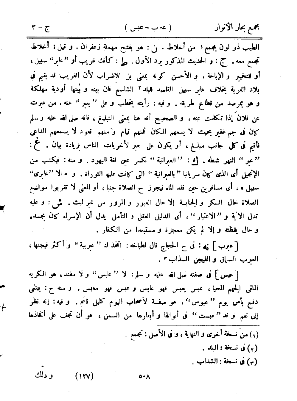 الطيب ذو لون يجمع من أخلاط. ن: هو بفتح مهملة زعفران، وقيل: اخلاط تجمع معه. ج: والحديث المذكور يرد الأول. ط: كأنك غريب أو "عابر" سبيل، أو للتخيير والإباحة، والأحسن كونه بمعنى بل للإضراب لأن الغريب قد يقيم في بلاد الغربة بخلاف عابر سبيل القاصد للبلد الشاسع فإن بينه وبينها أودية مهلك وهو بمرصد من قطاع طريقه. وفيه: رأيته يخطب وعلى "يعبر" عنه، من عبرت عن فلان إذا تكلمت عنه، والصحيح أنه هنا بمعنى التبليغ، فإنه صلى الله عليه وسلم كان في جم غفير بحيث لا يسعهم المكان فمنهم قيام ومنهم قعود لا يسمعهم الداعي فأقيم في كل جانب مبلغ، أو يكون علي يعبر لأخريات الناس بزيادة بيان. غ: "عبر" النهر شطه. ك: "العبرانية" بكسر عين لغة اليهود. ومنه: فيكتب من الإنجيل أي الذي كان سريانيًا "بالعبرانية" التي كانت عليها التوراة. و"ألا "عابري" سبيل"، أي مسافرين حين فقد الماء فيجوز ح الصلاة جنبًا، أو المعنى لا تقربوا مواضع الصلاة حال السكر والجنابة إلا حال العبور والمرور من غير لبث. ش: وعليه تدل الآية و"الاعتبار"، أي الدليل العقلي والتأمل يدل أن الإسراء كان بجسده وحال يقظته وإلا لم يكن معجزة ومستبعدًا من الكفار.