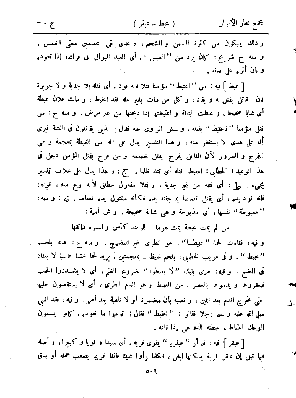 وفيه: فقاءت لحمًا "عبيطًا"، هو الطري غير النضيج. ومنه ح: فدعا بلحم "عبيط"، وفي غريب الخطابي: بلحم غليظ- بمعجمتين، يريد لحمًا خشنًا عاسيًا لا ينقاد في المضغ. وفيه: مرى بنيك "لا يعبطوا" ضروع الغنم، أي لا يشددوا الحلب فيعقروها ويدموها بالعصر، من العبيط وهو الدم الطري، أي لا يستقصون حلبها حتى يخرج الدم بعد اللبن، ونصبه بأن مضمرة أو لا ناهية بعد أمر. وفيه: فقد النبي صلى الله عليه وسلم رجلًا فقالوا: "اعتبط" فقال: قوموا بنا نعوده، كانوا يسمون الوعك اعتباطًا، عبطته الدواهي إذا نالته.