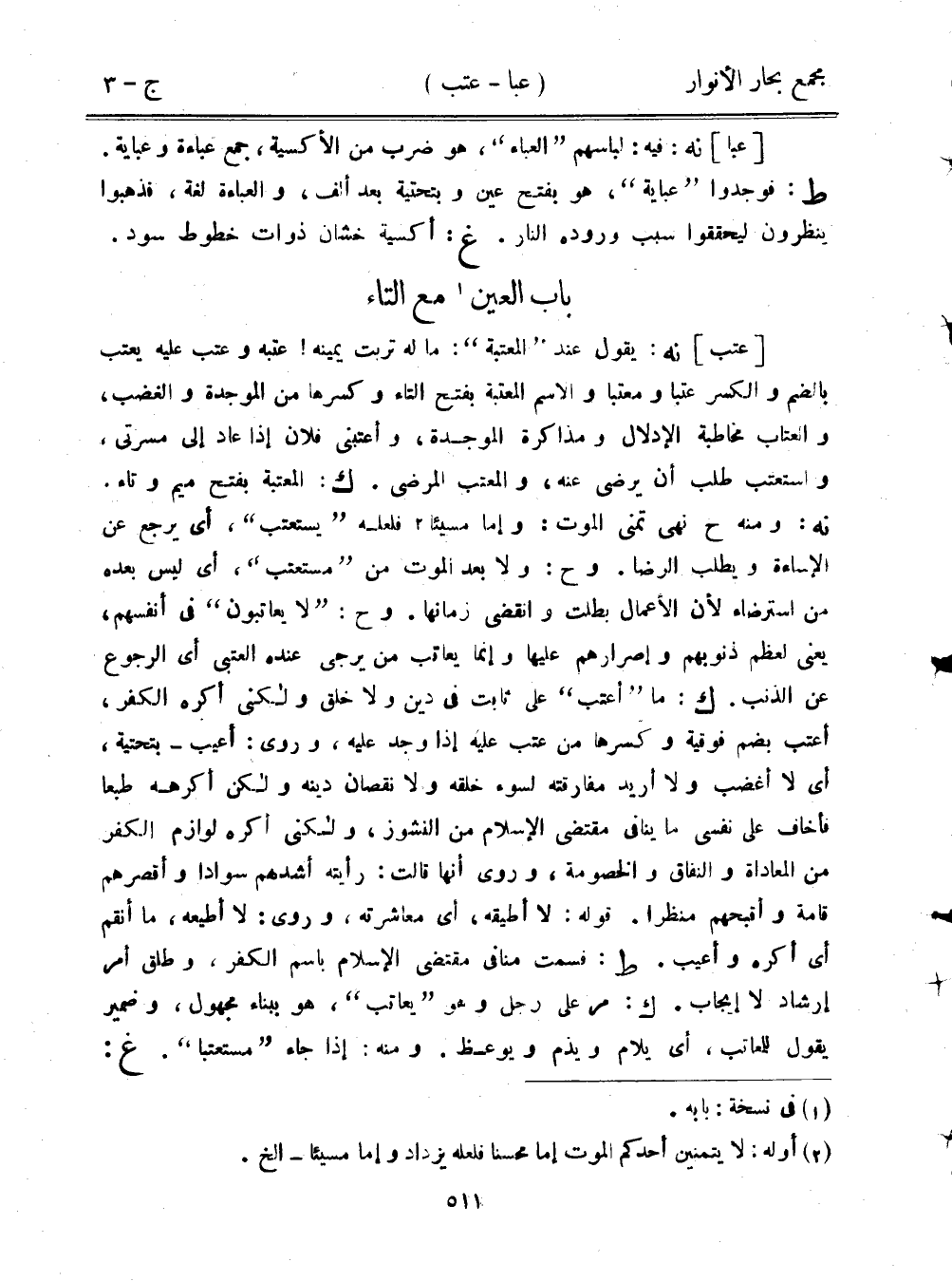 [عتب] نه: يقول عند "المعتبة": ما له تربت يمينه! عتبه وعتب عليه يعتب بالضم والكسر عتبًا ومعتبًا والاسم المعتبة بفتح التاء وكسرها من الموجدة والغضب، والعتاب مخاطبة الإدلال ومذاكرة الموجدة، وأعتبني فلان إذا عاد إلى مسرتي، واستعتب طلب أن يرضى عنه، والمعتب المرضي. ك: المعتبة بفتح ميم وتاء. نه: ومنه ح نهى تمني الموت: وإما مسيئًا فلعله "يستعتب"، أي يرجع عن الإساءة ويطلب الرضا. وح: ولا بعد الموت من "مستعتب"، أي ليس بعده من استرضاء لأن الأعمال بطلت وانقضى زمانها. وح: "لا يعاتبون" في أنفسهم، يعني لعظم ذنوبهم وإصرارهم عليها وإنما يعاتب من يرجى عنده العتبى أي الرجوع عن الذنب. ك: ما "أعتب" على ثابت في دين ولا خلق ولكني أكره الكفر، أعتب بضم فوقية وكسرها من عتب عليه إذا وجد عليه، وروى: أعيب- بتحتية، أي لا أغضب ولا أريد مفارقته لسوء خلقه ولا نقصان دينه ولكن أكرهه طبعًا فأخاف على نفسي ما ينافي مقتضى الإسلام من النشوز، ولكني أكره لوازم الكفر من المعاداة والنفاق والخصومة، وروى أنها قالت: رأيته أشدهم سوادًا وأقصرهم قامة وأقبحهم منظرًا. قوله: لا أطيقه، أي معاشرته، وروى: لا أطيعه، ما أنقم أي أكره وأعيب. ط: فسمت منافي مقتضى الإسلام باسم الكفر، وطلق أمر إرشاد لا إيجاب. ك: مر على رجل وهو "يعاتب"، هو ببناء مجهول، وضمير يقول للمعاتب، أي يلام ويذم ويوعظ. ومنه: إذا جاء "مستعتبًا". غ: