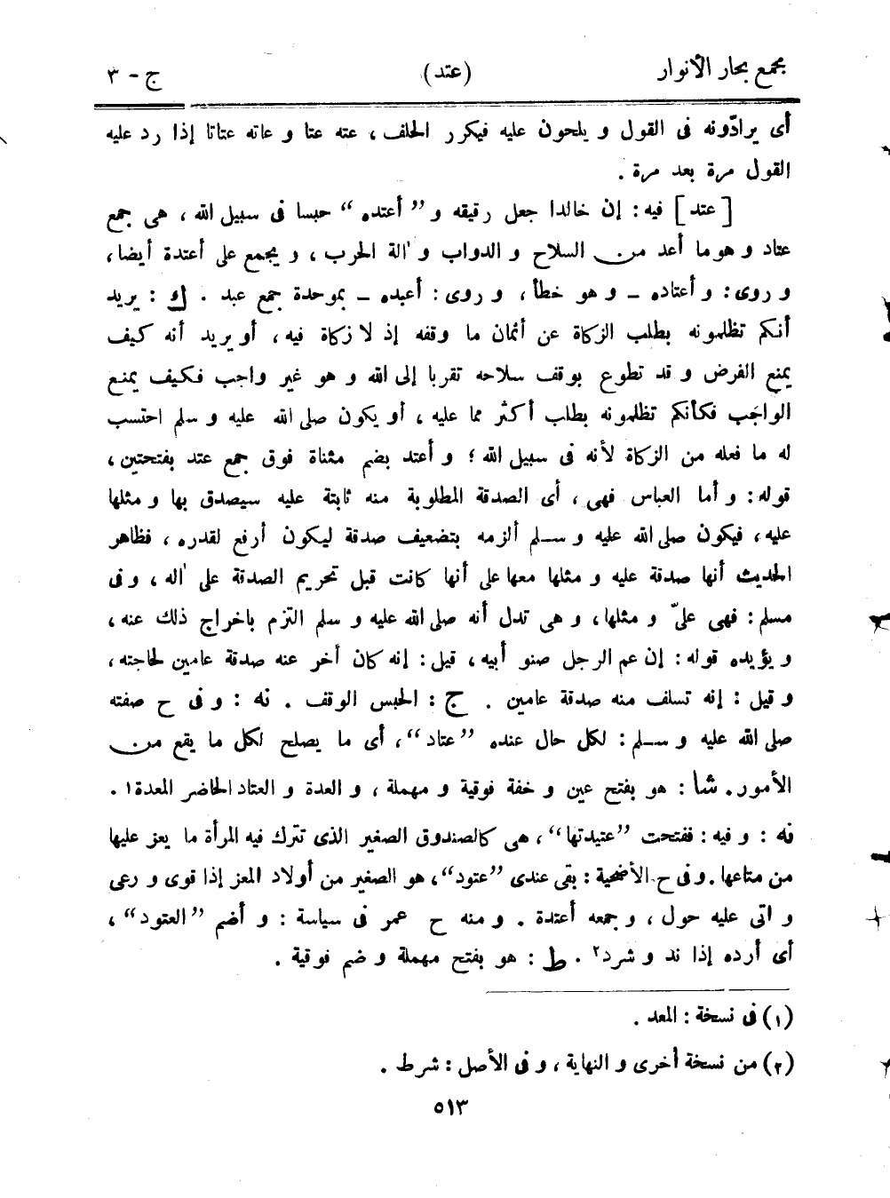 [عتد] فيه: إن خالدًا جعل رقيقه و"أعتده" حبسًا في سبيل الله، هي جمع عتاد وهو ما أعد من السلاح والدواب وآلة الحرب، ويجمع على أعتدة أيضًا، وروى: وأعتاده- وهو خطأ، وروى: أعبده- بموحدة جمع عبد. ك: يريد أنكم تظلمونه بطلب الزكاة عن أثمان ما وقفه إذ لا زكاة فيه، أو يريد أنه كيف يمنع الفرض وقد تطوع بوقف سلاحه تقربًا إلى الله وهو غير واجب فكيف يمنع الواجب فكأنكم تظلمونه بطلب أكثر مما عليه، أو يكون صلى الله عليه وسلم احتسب له ما فعله من الزكاة لأنه في سبيل الله؛ وأعتد بضم مثناة فوق جمع عتد بفتحتين، قوله: وأما العباس فهي، أي الصدقة المطلوبة منه ثابتة عليه سيصدق بها ومثلها عليه، فيكون صلى الله عليه وسلم ألزمه بتضعيف صدقة ليكون أرفع لقدره، فظاهر الحديث أنها صدقة عليه ومثلها معها على أنها كانت قبل تحريم الصدقة على آله، وفي مسلم: فهي علي ومثلها، وهي تدل أنه صلى الله عليه وسلم التزم بإخراج ذلك عنه، ويؤيده قوله: إن عم الرجل صنو أبيه، قيل: إنه كان أخر عنه صدقة عامين لحاجته، وقيل: إنه تسلف منه صدقة عامين. ج: الحبس الوقف. نه: وفي ح صفته صلى الله عليه وسلم: لكل حال عنده "عتاد"، أي ما يصلح لكل ما يقع من الأمور. شا: هو بفتح عين وخفة فوقية ومهملة، والعدة والعتاد الحاضر المعدة. نه: وفيه: ففتحت "عتيدتها"، هي كالصندوق الصغير الذي تترك فيه المرأة ما يعز عليها من متاعها. وفي ح الأضحية: بقي عندي "عتود"، هو الصغير من أولاد المعز إذا قوي ورعي وأتى عليه حول، وجمعه أعتدة. ومنه ح عمر في سياسة: وأضم "العتود"، أي أرده إذا ند وشرد. ط: هو بفتح مهملة وضم فوقية.