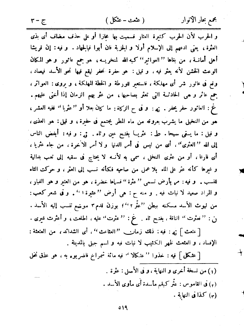 والحرب لأن الحرب كثيرة العثار فسميت بها مجازًا أو على حذف مضاف أي بذي العثرة، يعني ادعهم إلى الإسلام أولًا والجزية فإن أبوا فبالجهاد. وفيه: إن قريشًا أهل أمانة، من بغاها "العواثير" كبه الله لمنخريه، هو جمع عاثور وهو المكان الوعث الخشن لأنه يعثر فيه، وقيل: هو حفرة تحفر ليقع فيها نحو الأسد فيصاد، وقع في عاثور شر أي مهلكة، فاستعير للورطة والخطة المهلكة، ويروى: العواثر، جمع عاثر وهي الحادثة التي تعثر بصاحبها، من عثر بهم الزمان إذا أخنى عليهم. غ: العاثور حفر يحفر. نه: وفي ح الزكاة: ما كان بعلًا أو "عثريا" ففيه العشر، هو من النخيل ما يشرب بعروقه من ماء المطر يجتمع في حفيرة، وقيل: هو العذي، وقيل: ما يسقى سيحًا. ط: عثريًا بفتح عين وثاء. نه: وفيه: أبغض الناس إلى الله "العثري"، أي من ليس في أمر الدنيا ولا أمر الآخرة، من جاء عثريًا، أي فارغًا، أو من عثري النخل، سمي به لأنه لا يحتاج في سقيه إلىتعب بدالية وغيرها كأنه عثر على الماء بلا عمل من صاحبه فكأنه نسب إلى العثر، وحركت الثاء للنسب. وفيه: مر بأرض تسمى "عثرة" فسماها خضرة، هو من العثير وهو الغبار، والمراد صعيد لا نبات فيه. ومنه ح: هي أرض "عثيرة". وفي شعر كعب: من ليوث الأسد مسكنه ببطن "عثر"؛ بوزن قدم موضع تنسب إليه الأسد. ن: "فعثرت" الناقة، بفتح ثاء. غ: "عثرت" عليه، اطلعت، وأعثرت غيري.