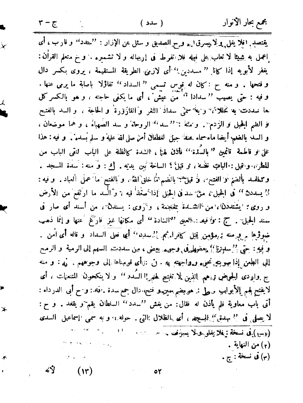 يقتصد فلا يغل ولا يسرق وح الصديق وسئل عن الإزار: "سدد" وقارب، أي اعمل به شيئًا لا تعاب على فعله فلا تفرط في إرساله ولا تشميره. وح متعلم القران: يغفر لأبويه إذا كانا "مسددين" أي لازمي الطريقة المستقيمة، يروى بكسر دال وفتحها. ومنه ح: كان له قوس تسمى "السداد" تفاؤلًا بإصابة ما يرمي عنها. وفيه: حتى يصيب "سدادًا" من عيش، أي ما يكفي حاجته، وهو بالكسر كل معا سددت به حللا، وبه يسمى سداد الثغر والقارورة والحاجة والسد بالفتح والضم الجبل والزدم. ومنه: "سد" الروحاء وسد الصهباء، وهما موضعان، والسد بالضم أيضا ماء سماء عند جبل لغطفان أمر صلى الله عليه وسلم بسده. وفيه هذا على وفاطمة قائمين "بالسدة" فأذن لهما، السدة كالظلمة على الباب لتقى الباب من للطر، وقيل: الباب نفسه، وقيل: الساخة بين يديه. ك: ومنه سدة المسجد. وكالد بالضم والفتح، وقيل: بالضم ما خلق الله. وبالفتح ما عمل العباد. وفيه: "يسدد" في الجبل، من سد في الجبل إذا صعد فيه، والسد ما ار تفع من الأرض وروى: يشتددن، من الشدة بمعجمة، وروى: يسندن، من أسند أي صار في سند الجبل. ج: وفيه: العين "السادة" أي مكانها غير فارغ عنها وإنما ذهب ضوؤها ومنه: مؤمن قتل كافرا ثم "سدد" أي فعل السداد وقاله أي امن. وفيه: حتى "سددنا" بعضها في وجوه بعض، من سددت السهم إلى الرمية والرمح إلى الطعن إذا صوبته نحوه وواجهته به. ن: أي قومناها إلى وجوههم. نه: ومنه ج واردى الحوض في هم الذين لا تفتح لهم "سدد" ولا ينكحون المتنعمات، أي لا يفتح لهم الأبواب. ط: هو بضم سين وفتح دال جمع سدة. نه: وح أبى الدرداء: أتى باب معاوية فلم يأذن له فقال: من يغش "سدد" السلطان يقم ويقعد. وح: لا يصلى في "سهدق" المسجد أي الظلال التى حوله وبه سمى إسماعيل السدى