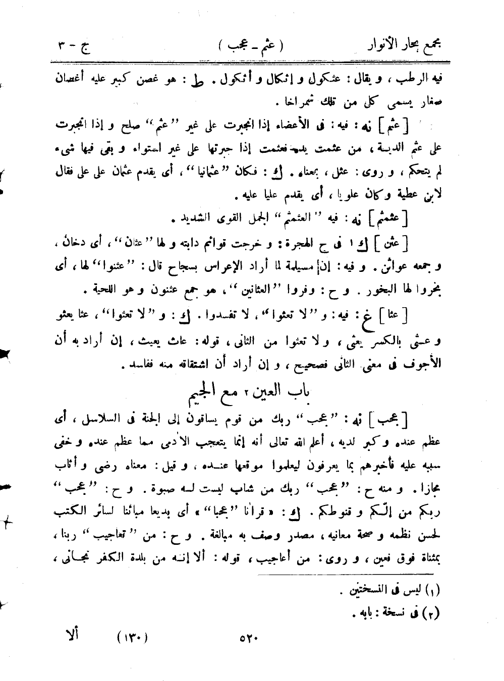 [عثن] ك في ح الهجرة: وخرجت قوائم دابته ولها "عثان"، أي دخان، وجعه عواثن. وفيه: إن مسيلمة لما أراد الإعراس بسجاح قال: "عثنوا" لها، أي بخروا لها البخور. وح: وفروا "العثانين"، هو جمع عثنون وهو اللحية.