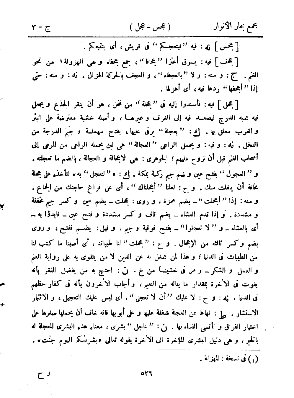 [عجل] فيه: فأسندوا إليه في "عجلة" من نخل، هو أن ينقر الجذع ويجعل فيه شبه الدرج ليصعد فيه إلى الغرف وغيرها، وأصله خشبة معترضة على البئر والغرب معلق بها. ك: "بعجلة" يرقى عليها، بفتح مهملة وجيم الدرجة من النخل. نه: وفيه: ويحمل الراعي "العجالة" هي لبن يحمله الراعي من المرعى إلى أصحاب الغنم قبل أن تروح عليهم؛ الجوهري: هي الإعجالة والعجالة، بالضم ما تعجلته. و"العجول" بفتح عين وضم جيم ركية بمكة. ك: ""لتعجل" به" لتأخذه على عجلة مخافة أن ينفلت منك. وح: لعلنا "أعجلناك"، أي عن فراغ حاجتك من الجماع. ومنه: إذا "أعجلت"- بضم همزة، وروى: عجلت- بضم عين وكسر جيم مخففة ومشددة. وإذا قدم العشاء- بضم قاف وكسر مشددة وفتح عين- فابدؤا به- أي بالعشاء- و"لا تعجلوا"- بفتح فوقية وجيم، وقيل: بضم ففتح، وروى بضم وكسر ثالثه من الإعجال. وح: "عجلت" لنا طيباتنا، أي أصبنا ما كتب لنا من الطيبات في الدنيا؛ وهذا لمن شغل به عن الدين لا من يتقوى به على رواية العلم والعمل والشكر- ومر في خشينا من خ. ن: احتج به من يفضل الفقر بأنه يفوت في الآخرة بمقدار ما يناله من النعيم، وأجاب الآخرون بأنه في كفار حظهم في الدنيا. نه: وح: لا عليك "أن لا تعجلي"، أي ليس عليك التعجيل، والائتمار الاستشار. ط: نهاها عن العجلة شفقة عليها وعلى أبويها فإنه خاف أن يحملها صغرها على اختيار الفراق وتأتسي النساء بها. ن: "عاجل" بشرى، معناه هذه البشرى المعجلة له بالخير، وهي دليل البشرى المؤخرة إلى الآخرة بقوله تعالى "بشراكم اليوم جنات".