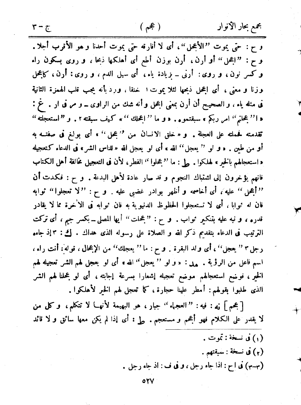 وح: حتى يموت "الأعجل"، أي لا أفارقه حتى يموت أحدنا وهو الأقرب أجلًا. وح: "اعجل" أو أرن، أرن بوزن أطع أي أهلكها ذبحًا، وروى بسكون راء وكسر نون، وروى: أرني- بزيادة ياء، أي سيل الدم، وروى: أرن، كاعجل وزنا ومعنى، أي اعجل ذبحها لئلا يموت خنقًا، ورد بأنه يجب قلب الهمزة الثانية في مثله ياء، والصحيح أن أرن بمعنى أعجل وأنه شك من الراوي- ومر في ار. غ: "ا"عجلتم" أمر ربكم" سبقتموه. "وما "أعجلك"" كيف سبقته. و"استعجلته" تقدمته فحملته على العجلة. و"خلق الإنسان من "عجل"" أي بولغ في صفته به أو من طين. "ولو "يعجل" الله" أي لو يعجل الله "للناس الشر" في الدعاء كتعجيله "استعجالهم بالخير" لهلكوا. ط: ما "عجلوا" الفطر، لأن في التعجيل مخالفة أهل الكتاب فإنهم يؤخرون إلى اشتباك النجوم وقد صار عادة لأهل البدعة. وح: فكدت أن "أعجل" عليه، أي أخاصمه وأظهر بوادر غضبى عليه. وح: "لا تعجلوا" ثوابه فإن له ثوابًا، أي لا تستعجلوا الحظوظ الدنيوية به فإن ثوابه في الآخرة مما لا يقادر قدره، ونبه عليه بتنكير ثواب. وح: "عجلت" أيها المصلي- بكسر جيم، أي تركت الترتيب في الدعاء بتقديم ذكر الله والصلاة على رسوله الذي هداك. ك: إذ جاءه رجل "يعجل"، أي ولد البقرة. وح: ما "يعجلك" من الإعجال، قوله: أنت راء، اسم فاعل من الرؤية. مد: "ولو "يعجل" الله" أي لو يعجل لهم الشر تعجيله لهم الخير، فوضع استعجالهم موضع تعجيله إشعارًا بسرعة إجابته، أي لو عجلنا لهم الشر الذي طلبوا بقولهم: أمطر علينا حجارة، كما تعجل لهم الخير لأهلكوا.