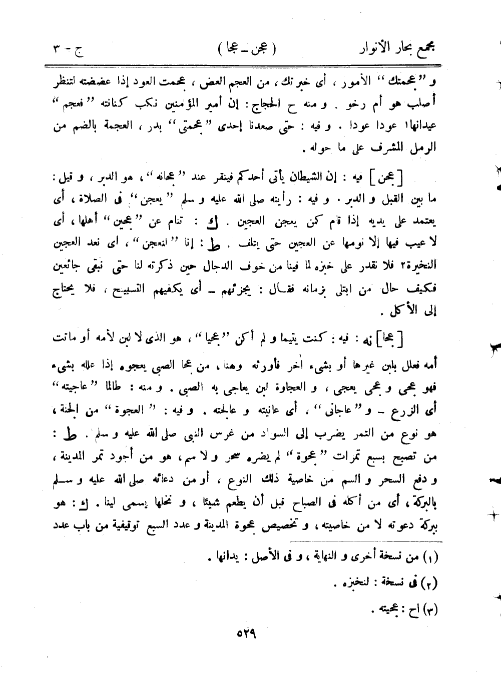 [عجا] نه: فيه: كنت يتيمًا ولم أكن "عجيًا"، هو الذي لا لبن لأمه أو ماتت أمه فعلل بلبن غيرها أو بشيء آخر فأورثه وهنا، من عجا الصبي يعجوه إذا علله بشيء فهو عجى وعجى يعجي، والعجاوة لبن يعاجي به الصبي. ومنه: طالما "عاجيته" أي الزرع- و"عاجاني"، أي عانيته وعالجته. وفيه: "العجوة" من الجنة، هو نوع من التمر يضرب إلى السواد من غرس النبي صلى الله عليه وسلم. ط: من تصبح بسبع تمرات "عجوة" لم يضره سحر ولا سم، هو من أجود تمر المدينة، ودفع السحر والسم من خاصية ذلك النوع، أو من دعائه صلى الله عليه وسلم بالبركة، أي من أكله في الصباح قبل أن يطعم شيئًا، ونخلها يسمى لينا. ك: هو ببركة دعوته لا من خاصيته، وتخصيص عجوة المدينة وعدد السبع توقيفية من باب عدد