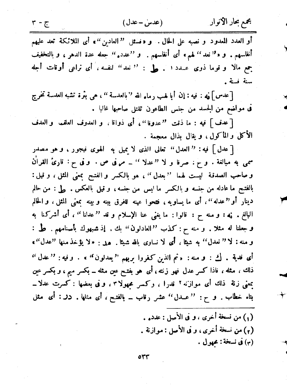 [عدل] فيه: "العدل" تعالى الذي لا يميل به الهوى فيجوز، وهو مصدر سمي به مبالغة. وح: صرفًا ولا "عدلًا"- مر في ص. وفي ح: قارئ القرآن وصاحب الصدقة ليست لهما "بعدل"، هو بالكسر والفتح بمعنى المثل، وقيل: بالفتح ما عادله من جنسه وبالكسر ما ليس من جنسه، وقيل بالعكس. ط: من حالم دينار أو "عدله"، أي ما يساويه، فتحوا عينه للفرق بينه وبينه بمعنى المثل، والحالم البالغ. نه: ومنه ح: قالوا: ما يغني عنا الإسلام وقد "عدلنا"، أي أشركنا به وجعلنا له مثلًا. ومنه ح: كذب "العادلون" بك، إذ شبهوك بأصنامهم. ط: ومنه: لا "نعدل" به شيئًا، أي لا نساوي بالله شيئًا. مد: "لا يؤخذ منها "عدل"" أي فدية. ك: ومنه: "ثم الذين كفروا بربهم "يعدلون"". وفيه: "عدل" ذلك، مثله، فإذا كسر عدل فهو زنته، أي هو بفتح عين مثله- بكسر ميم، وبكسر عين بمعنى زنة ذلك أي موازنة قدرًا، وكسر مجهولًا، وفي بعضها: كسرت عدلًا- بتاء خطاب. وح: "عدل" عشر رقاب- بالفتح، أي مثلها. در: أي مثل