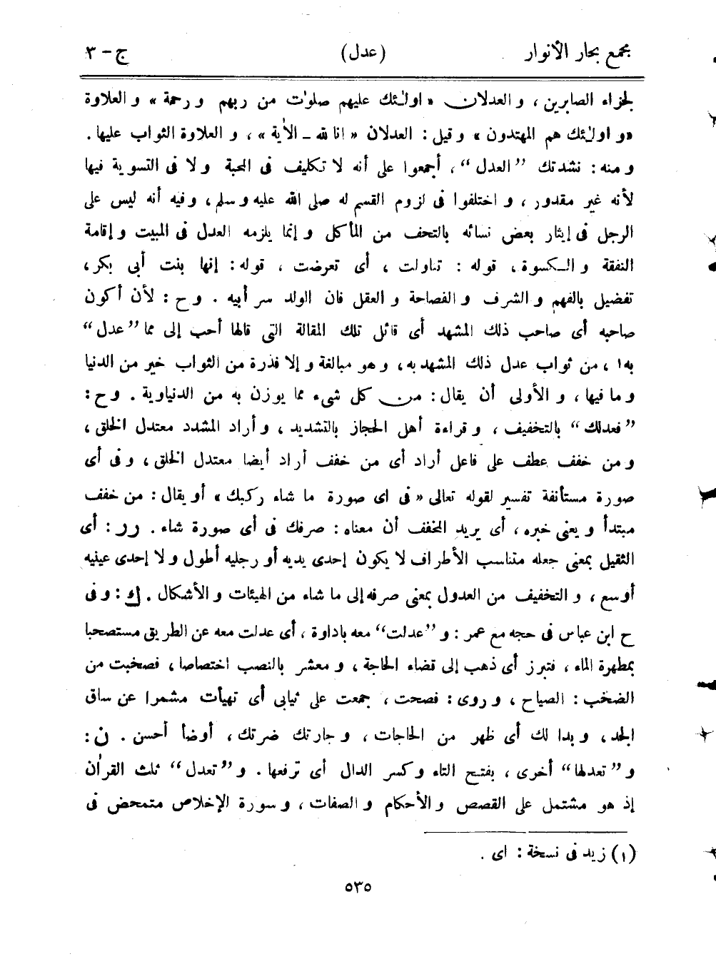 لجزاء الصابرين، والعدلان "أولئك عليهم صلوات من ربهم ورحمة" والعلاوة "وأولئك هم المهتدون" وقيل: العدلان "إنا لله- الآية"، والعلاوة الثواب عليها. ومنه: نشدتك "العدل"، أجمعوا على أنه لا تكليف في المحبة ولا في التسوية فيها لأنه غير مقدور، واختلفوا في لزوم القسم له صلى الله عليه وسلم، وفيه أنه ليس على الرجل في إيثار بعض نسائه بالتحف من المأكل وإنما يلزمه العدل في المبيت وإقامة النفقة والكسوة، قوله: تناولت، أي تعرضت، قوله: إنها بنت أبي بكر، تفضيل بالفهم والشرف والفصاحة والعقل فإن الولد سر أبيه. وح: لأن أكون صاحبه أي صاحب ذلك المشهد أي قائل تلك المقالة التي قالها أحب إلي مما "عدل" به، من ثواب عدل ذلك المشهد به، وهو مبالغة وإلا فذرة من الثواب خير من الدنيا وما فيها، والأولى أن يقال: من كل شيء مما يوزن به من الدنياوية. وح: "فعدلك" بالتخفيف، وقراءة أهل الحجاز بالتشديد، وأراد المشدد معتدل الخلق، ومن خفف عطف على فاعل أراد أي من خفف أراد أيضًا معتدل الخلق، وفي أي صورة مستأنفة تفسير لقوله تعالى "في أي صورة ما شاء ركبك" أو يقال: من خفف مبتدأ ويعني خبره، أي يريد المخفف أن معناه: صرفك في أي صورة شاء. رر: أي الثقيل بمعنى جعله متناسب الأطراف لا يكون إحدى يديه أو رجليه أطول ولا إحدى عينيه أوسع، والتخفيف من العدول بمعنى صرفه إلى ما شاء من الهيئات والأشكال. ك: وفي ح ابن عباس في حجه مع عمر: و"عدلت" معه بأداوة، أي عدلت معه عن الطريق مستصحبًا بمطهرة الماء، فتبرز أي ذهب إلى قضاء الحاجة، ومعشر بالنصب اختصاصًا، فصخبت من الضخب: الصياح، وروى: فصحت، جمعت على ثيابي أي تهيأت مشمرًا عن ساق الجد، وبدا لك أي ظهر من الحاجات، وجارتك ضرتك، أوضأ أحسن. ن: و"تعدلها" أخرى، بفتح التاء وكسر الدال أي ترفعها. و"تعدل" ثلث القرآن إذ هو مشتمل على القصص والأحكام والصفات، وسورة الإخلاص متمحض في