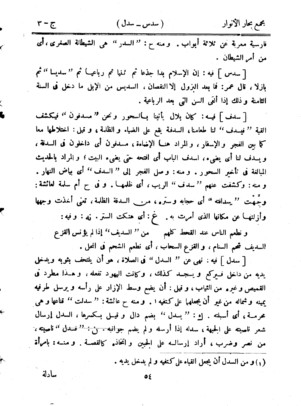 [سدف] فيه: كان بلال يأتينا بالسحور ونحن "مسدفون" فيكشف القبة "فيسدف" لما طعامنا، السدفة يقع على الضياء والظلمة، وقيل: اختلاطها معا كما بين الفجر والإسفار، والمراد هنا الإضاءة، مسدفون أي داخلون في السدفة، ويسدف لنا أي يضىء، أسدف الباب أي افتحه حتى يضىء البيت، والمراد بالحديث المبالغة في تأخير السحور. ومنه: وصل الفجر إلى "السدف" أي بياض النهار. ومنه: وكشفت عنهم "سدف" الريب، أي ظلمها. وفي ح أم سلمة لعائشة: وجبهت "سدافته" أي حجابه وستره، من السدفة الظلمة، تعنى أخذت وجهها وأزلتها عن مكانها الذي أمرت به. غ: أي هتكت الستر. نه: وفيه: ونطعم الناس عند القحط كلهم من "السديف" إذا لم يؤنس القزع السديف شحم السنام، والقزع السحاب، أي نطعم الشحم في المحل.
