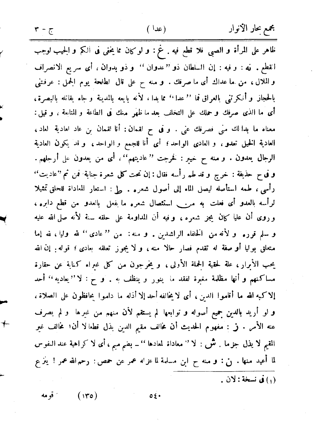 ظاهر على المرأة والصبي فلا قطع فيه. غ: ولو كان مما يخفى في الكم والجيب لوجب القطع. نه: وفيه: إن السلطان ذو "عدوان" وذو بدوان، أي سريع الانصراف والملال، من ما عداك أي ما صرفك. ومنه ح علي قال لطلحة يوم الجمل: عرفتني بالحجاز وأنكرتني بالعراق فما "عدا" مما بدا، لأنه بايعه بالمدينة وجاء يقاتله بالبصرة، أي ما الذي صرفك وحملك على التخلف بعد ما ظهر منك في الطاعة والمتابعة، وقيل: معناه ما بدا لك مني فصرفك عني. وفي ح قلقمان: أنا لقمان بن عاد لعادية لعاد، العادية الخيل تعدو، والعادي الواحد؛ أي أنا للجمع والواحد، وقد يكون العادية الرجال يعدون. ومنه ح خيبر: فخرجت "عاديتهم"، أي من يعدون على أرجلهم. وفي ح حذيفة: خرج وقد طم رأسه فقال: إن تحت كل شعرة جنابة فمن ثم "عاديت" رأسي، طمه استأصله ليصل الماء إلى أصول شعره. ط: استعار المعاداة للحلق تمثيلًا لرأسه بالعدو أي فعلت به من استئصال شعره ما يفعل بالعدو من قطع دابره، وروى أن عليًا كان يجز شعره، وفيه أن المداومة على حلقه سنة لأنه صلى الله عليه وسلم قرره ولأنه من الخلفاء الراشدين. ومنه: من "عادى" لله وليًا، لله إما متعلق بوليا أو صفة له تقدم فصار حالًا منه، ولا يجوز تعلقه بعادي؛ قوله: إن الله يحب الأبرار، علة لحقية الجملة الأولى، ويخرجون من كل غبراء كناية عن حقارة مساكنهم وأنها مظلمة مغبرة لفقد ما ينور وينظف به. وح: لا "يعاديه" أحد إلا كبه الله ما أقاموا الدين، أي لا يخالفه أحد إلا أذله ما داموا يحافظون على الصلاة، ولو أريد بالدين جميع أصوله وتوابعها لم يستقم لأن منهم من غيرها ولم يصرف عنه الأمر. ز: مفهوم الحديث أن مخالف مقيم الدين يذل قطعًا لا أن مخالف غير المقيم لا يذل جزمًا. ش: لا "معاداة لمعادها"- بضم ميم، أي لا كراهية عند النفوس لما أعيد منها. ن: ومنه ح ابن مسلمة لما عزله عمر عن حمص: رحم الله عمر! ينزع