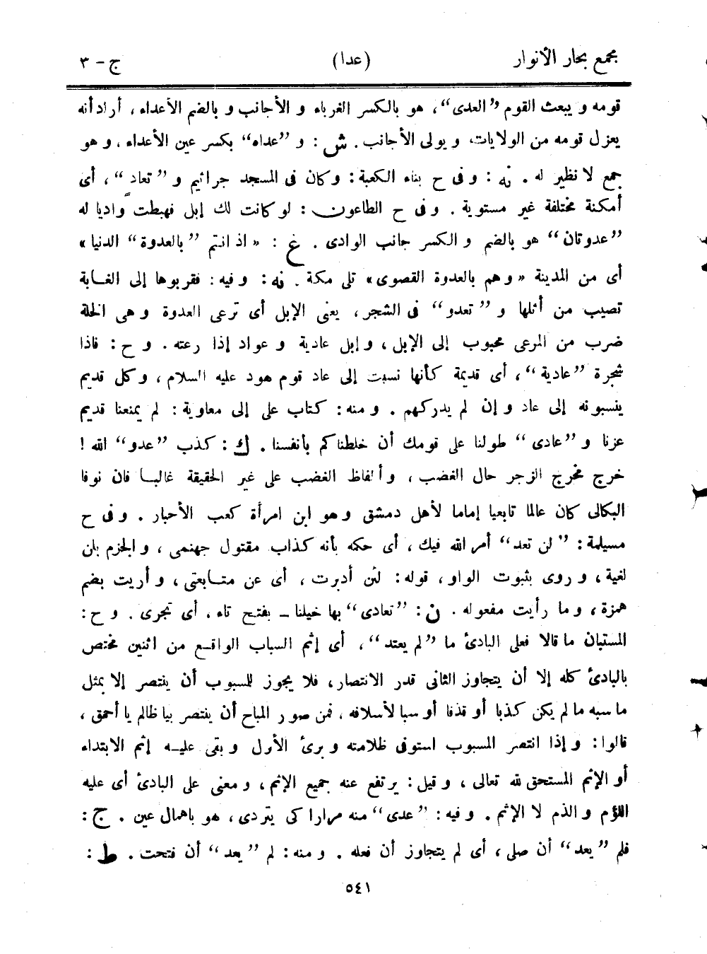 قومه ويبعث القوم "العدي"، هو بالكسر الغرباء والأجانب وبالضم الأعداء، أراد أنه يعزل قومه من الولايات ويولي الأجانب. ش: و"عداه" بكسر عين الأعداء، وهو جمع لا نظير له. نه: وفي ح بناء الكعبة: وكان في المسجد جراثيم و"تعاد"، أي أمكنة مختلفة غير مستوية. وفي ح الطاعون: لو كانت لك إبل فهبطت واديًا له "عدوتان" هو بالضم والكسر جانب الوادي. غ: "إذ أنتم "بالعدوة" الدنيا" أي من المدينة "وهم بالعدوة القصوى" تلي مكة. نه: وفيه: فقربوها إلى الغابة تصيب من أثلها و"تعدو" في الشجر، يعني الإبل أي ترعى العدوة وهي الخلة ضرب من المرعى محبوب إلى الإبل، وإبل عادية وعواد إذا رعته. وح: فإذا شجرة "عادية"، أي قديمة كأنها نسبت إلى عاد قوم هود عليه السلام، وكل قديم ينسبونه إلى عاد وإن لم يدركهم. ومنه: كتاب علي إلى معاوية: لم يمنعنا قديم عزنا و"عادى" طولنا على قومك أن خلطناكم بأنفسنا. ك: كذب "عدو" الله! خرج مخرج الزجر حال الغضب، وألفاظ الغضب على غير الحقيقة غالبًا فإن نوفا البكالى كان عالمًا تابعيًا إمامًا لأهل دمشق وهو ابن امرأة كعب الأحبار. وفي ح مسيلمة: "لن تعد" أمر الله فيك، أي حكمه بأنه كذاب مقتول جهنمي، والجزم بأن لغية، وروى بثبوت الواو، قوله: لئن أدبرت، أي عن متابعتي، وأريت بضم همزة، وما رأيت مفعوله. ن: "تعادى" بها خيلنا- بفتح تاء، أي تجري. وح: المستبان ما قالا فعلى البادئ ما "لم يعتد"، أي إثم السباب الواقع من اثنين مختص بالبادئ كله إلا أن يتجاوز الثاني قدر الانتصار، فلا يجوز للمسبوب أن ينتصر إلا بمثل ما سبه ما لم يكن كذبًا أو قذفًا أو سبا لأسلافه، فمن صور المباح أن ينتصر بيا ظالم يا أحمق، قالوا: وإذا انتصر المسبوب استوفى ظلامته وبرئ الأول وبقي عليه إثم الابتداء أو الإثم المستحق لله تعالى، وقيل: يرتفع عنه جميع الإثم، ومعنى على البادئ أي عليه اللؤم والذم لا الإثم. وفيه: "عدى" منه مرارًا كي يتردى، هو بإهمال عين. ج: فمل "يعد" أن صلى، أي لم يتجاوز أن فعله. ومنه: لم "يعد" أن فتحت. ط:
