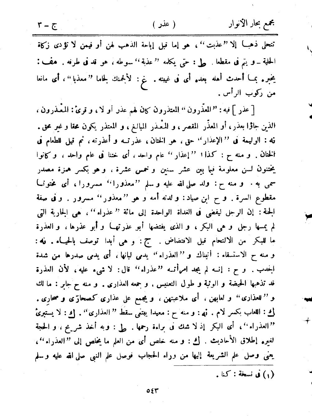 [عذر] فيه: "المعذرون" المعتذرون كان لهم عذر أو لا، وقرئ: المعذرون، الذين جاؤا بعذر، أو المعذر المقصر، والمعذر المبالغ، والمعتذر يكون محقًا وغير محق. نه: الوليمة في "الإعذار" حق، هو الختان، عذرته وأعذرته، ثم قيل للطعام في الختان. ومنه ح: كذا "إعذار" عام واحد، أي ختنا في عام واحد، وكانوا يختنون لسن معلومة فيما بين عشر سنين وخمس عشرة، وهو بكسر همزة مصدر سمي به. ومنه ح: ولد صلى الله عليه وسلم "معذورًا" مسرورًا، أي مختونًا مقطوع السرة. وح ابن صياد: ولدته أمه وهو "معذور" مسرور. وفي صفة الجنة: إن الرجل ليفضى في الغداة الواحدة إلى مائة "عذراء"، هي الجارية التي لم يمسها رجل وهي البكر، والذي يفتضها أبو عذرتها وأبو عذرها، والعذرة ما للبكر من الالتحام قبل الافتضاض. ج: وهي أبدًا توصف بالحياء. نه: ومنه ح الاستسقاء: أتيناك و"العذراء" يدمى لبانها، أي يدمى صدرها من شدة الجدب. وح: إنه لم يجد امرأته "عذراء" قال: لا شيء عليه، لأن العذرة قد تذهبها الحيضة والوثبة وطول التعنيس، وجمعه العذارى. ومنه ح جابر: ما لك و"للعذارى" ولعابهن، أي ملاعبتهن، ويجمع على عذارى كصحاري وصحاري. ك: اللعاب بكسر لام. نه: ومنه ح: معيدًا يبتغى سقط "العذارى". ك: لا يستبرئ "العذراء"، أي البكر إذ لا شك في براءة رحمها. ط: وبه أخذ شريح، والحجة لغيره إطلاق الأحاديث. ك: ومنه خلص أي من العلم ما يخلص إلى "العذراء"، يعني وصل علم الشريعة إليها من وراء الحجاب فوصل علم النبي صلى الله عليه وسلم