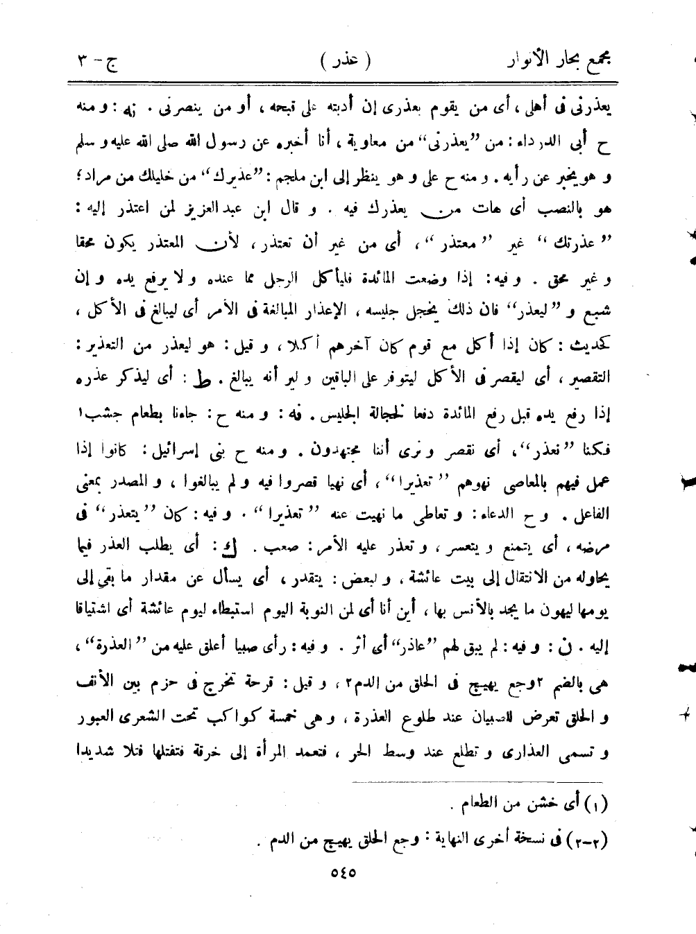 يعذرني في أهلي، أي من يقوم بعذري إن أدبته على قبحه، أو من ينصرني. نه: ومنه ح أبي الدرداء: من "يعذرني" من معاوية، أنا أخبره عن رسول الله صلى الله عليه وسلم وهو يخبر عن رأيه. ومنه ح علي وهو ينظر إلى ابن ملجم: "عذيرك" من خليلك من مراد؛ هو بالنصب أي هات من يعذرك فيه. وقال ابن عبد العزيز لمن اعتذر إليه: "عذرتك" غير "معتذر"، أي من غير أن تعتذر، لأن المعتذر يكون محقًا وغير محق. وفيه: إذا وضعت المائدة فليأكل الرجل مما عنده ولا يرفع يده وإن شبع و"ليعذر" فإن ذلك يخجل جليسه، الإعذار المبالغة في الأمر أي ليبالغ في الأكل، كحديث: كان إذا أكل مع قوم كان آخرهم أكلًا، وقيل: هو ليعذر من التعذير: التقصير، أي ليقصر في الأكل ليتوفر على الباقين ولير أنه يبالغ. ط: أي ليذكر عذره إذا رفع يده قبل رفع المائدة دفعًا لخجالة الجليس. نه: ومنه ح: جاءنا بطعام جشب فكنا "نعذر"، أي نقصر ونرى أننا مجتهدون. ومنه ح بني إسرائيل: كانوا إذا عمل فيهم بالمعاصي نهوهم "تعذيرًا"، أي نهيًا قصروا فيه ولم يبالغوا، والمصدر بمعنى الفاعل. وح الدعاء: وتعاطى ما نهيت عنه "تعذيرًا". وفيه: كان "يتعذر" في مرضه، أي يتمنع ويتعسر، وتعذر عليه الأمر: صعب. ك: أي يطلب العذر فيما يحاوله من الانتقال إلى بيت عائشة، ولبعض: يتقدر، أي يسأل عن مقدار ما بقي إلى يومهما ليهون ما يجد بالأنس بها، اين أنا أي لمن النوبة اليوم استبطاء ليوم عائشة أي اشتياقًا إليه. ن: وفيه: لم يبق لهم "عاذر" أي أثر. وفيه: رأى صبيًا أعلق عليه من "العذرة"، هي بالضم وجع يهيج في الحلق من الدم، وقيل: قرحة تخرج في حزم بين الأنف والحلق تعرض للصبيان عند طلوع العذرة، وهي خمسة كواكب تحت الشعري العبور وتسمى العذارى وتطلع عند وسط الحر، فتعمد المرأة إلى خرقة فتفتلها فتلًا شديدًا