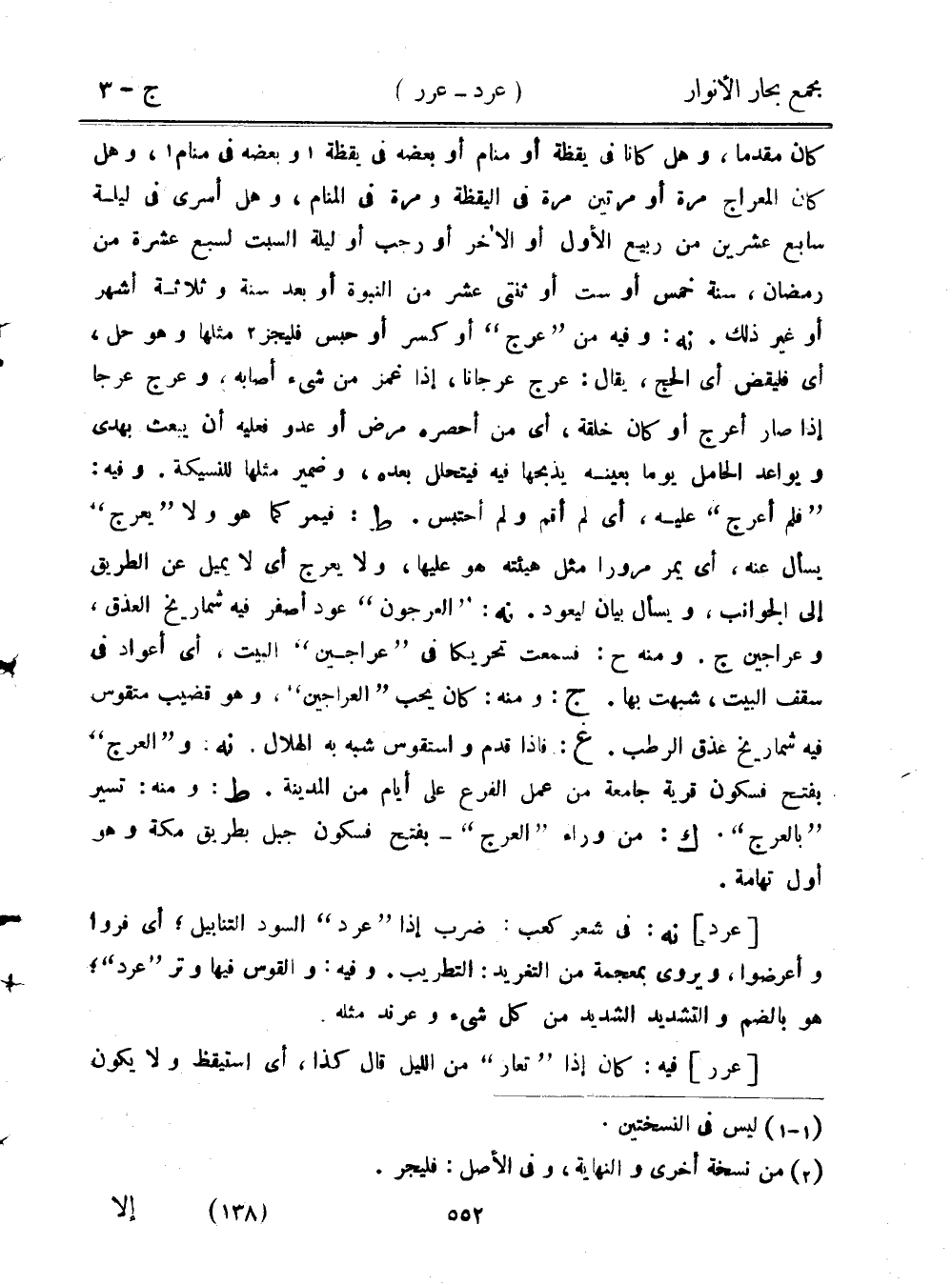 كان مقدمًا، وهل كانا في يقظة أو منام أو بعضه في يقظة وبعضه في منام، وهل كان المعراج مرة أو مرتين مرة في اليقظة ومرة في المنام، وهل أسرى في ليلة سابع عشرين من ربيع الأول أو الآخر أو رجب أو ليلة السبت لسبع عشرة من رمضان، سنة خمس أو ست أو ثنتي عشر من النبوة أو بعد سنة وثلاثة أشهر أو غير ذلك. نه: وفيه من "عرج" أو كسر أو حبس فليجز مثلها وهو حل، أي فليقض أي الحج، يقال: عرج عرجانًا، إذا غمز من شيء أصابه، وعرج عرجًا إذا صار أعرج أو كان خلقة، أي من أحصره مرض أو عدو فعليه أن يبعث بهدى ويواعد الحامل يومًا بعينه يذبحها فيه فيتحلل بعده، وضمير مثلها للنسيكة. وفيه: "فلم أعرج" عليه، أي لم أقم ولم أحتبس. ط: فيمر كما هو ولا "يعرج" يسأل عنه، أي يمر مرورًا مثل هيئته هو عليها، ولا يعرج أي لا يميل عن الطريق إلى الجوانب، ويسأل بيان ليعود. نه: "العرجون" عود أصفر فيه شماريخ العذق، وعراجين ج. ومنه ح: فسمعت تحريكًا في "عراجين" البيت، أي أعواد في سقف البيت، شبهت بها. ج: ومنه: كان يحب "العراجين"، وهو قضيب منقوس فيه شماريخ عذق الرطب. غ: فإذا قدم واستقوس شبه به الهلال. نه: و"العرج" بفتح فسكون قرية جامعة من عمل الفرع على أيام من المدينة. ط: ومنه: تسير "بالعرج". ك: من وراء "العرج"- بفتح فسكون جبل بطريق مكة وهو أول تهامة.