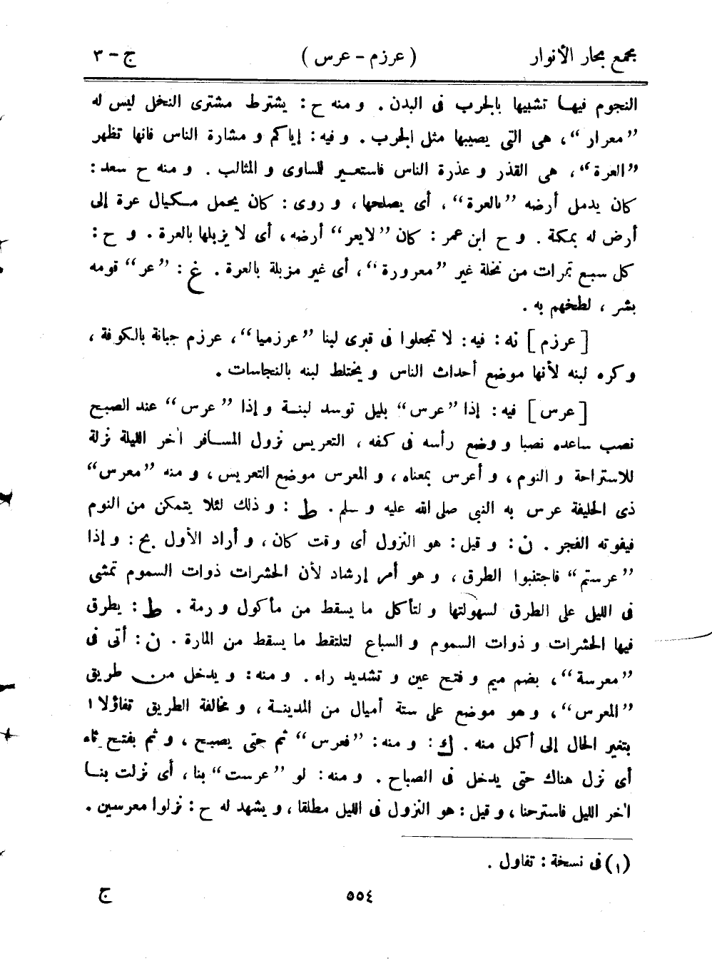 [عرس] فيه: إذا "عرس" بليل توسد لبنة وإذا "عرس" عند الصبح نصب ساعده نصبًا ووضع رأسه في كفه، التعريس نزول المسافر آخر الليلة نزلة للاستراحة والنوم، وأعرس بمعناه، والمعرس موضع التعريس، ومنه "معرس" ذي الحليفة عرس به النبي صلى الله عليه وسلم. ط: وذلك لئلا يتمكن من النوم فيفوته الفجر. ن: وقيل: هو النزول أي وقت كان، وأراد الأول بح: وإذا "عرستم" فاجتنبوا الطرق، وهو أمر إرشاد لأن الحشرات ذوات السموم تمشي في الليل على الطرق لسهولتها ولتأكل ما يسقط من مأكول ورمة. ط: يطرق فيها الحشرات وذوات السموم والسباع لتلتقط ما يسقط من المارة. ن: أتى في "معرسة"، بضم ميم وفتح عين وتشديد راء. ومنه: ويدخل من طريق "المعرس"، وهو موضع على ستة أميال من المدينة، ومخالفة الطريق تفاؤلًا بتغير الحال إلى أكمل منه. ك: ومنه: "فعرس" ثم حتى يصبح، وثم بفتح ثاء أي نزل هناك حتى يدخل في الصباح. ومنه: لو "عرست" بنا، أي نزلت بنا آخر الليل فاسترحنا، وقيل: هو النزول في الليل مطلقًا، ويشهد له ح: نزلوا معرسين.
