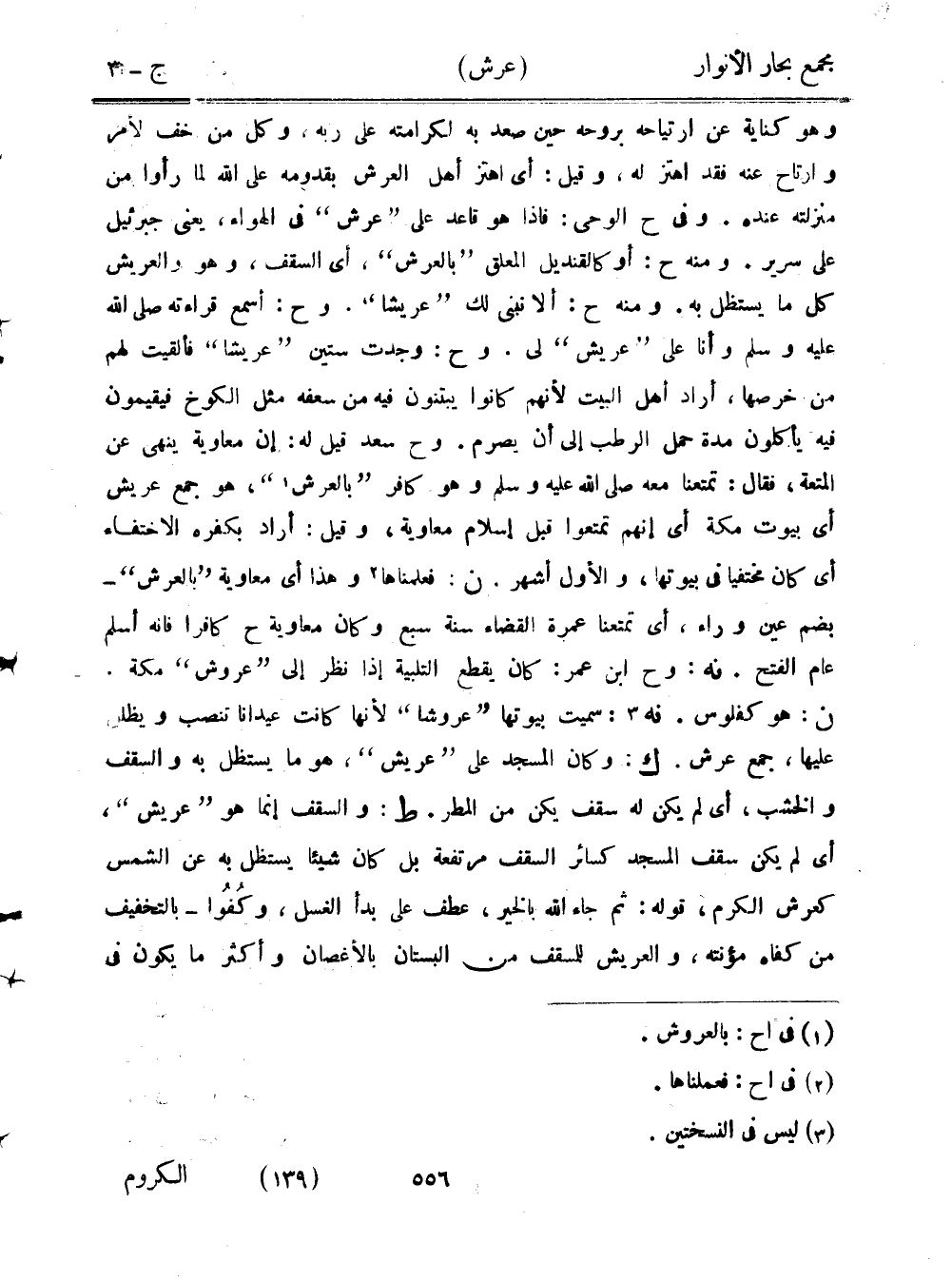 وهو كناية عن ارتياحه بروحه حين صعد به لكرامته على ربه، وكل من خف الأمر وارتاح عنه فقد اهتز له، وقيل: أي اهتز أهل العرش بقدومه على الله لما رأوا من منزلته عنده. وفي ح الوحي: فإذا هو قاعد على "عرش" في الهواء، يعني جبرئيل على سرير. ومنه ح: أو كالقنديل المعلق "بالعرش"، أي السقف، وهو والعريش كل ما يستظل به. ومنه ح: ألا نبني لك "عريشًا". وح: أسمع قراءته صلى الله عليه وسلم وأنا على "عريش" لي. وح: وجدت ستين "عريشًا" فألقيت لهم من خرصها، أراد أهل البيت لأنهم كاوا يبتنون فيه من سعفه مثل الكوخ فيقيمون فيه يأكلون مدة حمل الرطب إلى أن يصرم. وح سعد قيل له: إن معاوية ينهى عن المتعة، فقال: تمتعنا معه صلى الله عليه وسلم وهو كافر "بالعرش"، هو جمع عريش أي بيوت مكة أي إنهم تمتعوا قبل إسلام معاوية، وقيل: أراد بكفره الاختفاء أي كان مختفيًا في بيوتهان والأول أشهر. ن: فعلمناها وهذا أي معاوية "بالعرش"- بضم عين وراء، أي تمتعنا عمرة القضاء سنة سبع وكان معاوية ح كافرًا فإنه أسلم عام الفتح. نه: وح ابن عمر: كان يقطع التلبية إذا نظر إلى "عروش" مكة. ن: هو كفلوس. نه: سميت بيوتها "عروشًا" لأنها كانت عيدانًا تنصب ويظلل عليها، جمع عرش. ك: وكان المسجد على "عريش"، هو ما يستظل به والسقف والخشب، أي لم يكن له سقف يكن من المطر. ط: والسقف إنما هو "عريش"، أي لم يكن سقف المسجد كسائر السقف مرتفعة بل كان شيئًا يستظل به عن الشمس كعرش الكرم، قوله: ثم جاء الله بالخير، عطف على بدأ الغسل، وكفوا- بالتخفيف من كفاه مؤنته، والعريش للمسقف من البستان بالأغصان وأكثر ما يكون في