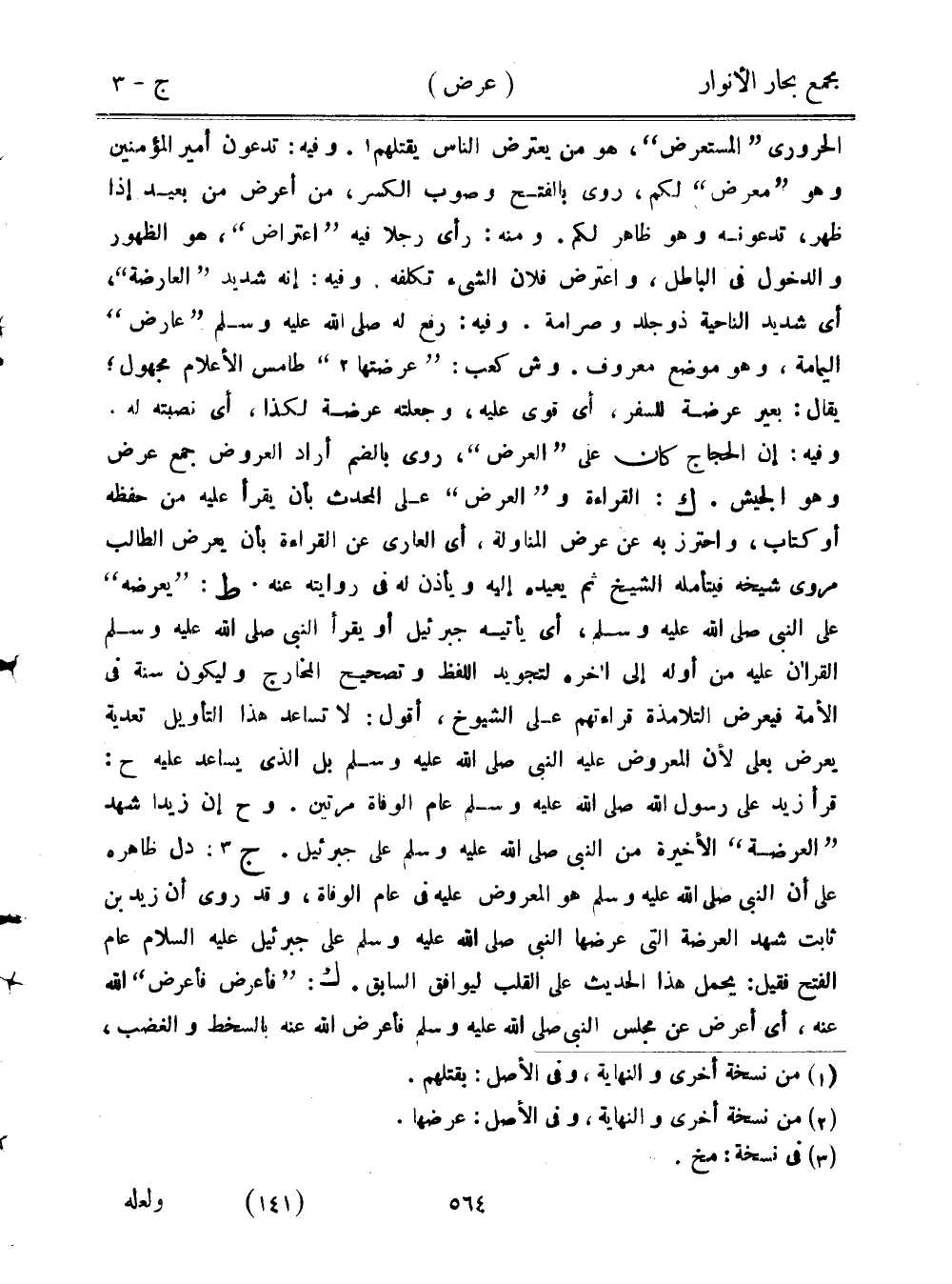 الحروري "المستعرض"، هو من يعترض الناس يقتلهم. وفيه: تدعون أمير المؤمنين وهو "معرض" لكم، روى بالفتح وصوب الكسر، من أعرض من بعيد إذا ظهر، تدعونه وهو ظاهر لكم. ومنه: رأى رجلًا فيه "اعتراض"، هو الظهور والدخول في الباطل، واعترض فلان الشيء تكلفه. وفيه: إنه شديد "العارضة"، أي شديد الناحية ذو جلد وصرامة. وفيه: رفع له صلى الله عليه وسلم "عارض" اليمامة، وهو موضع معروف. وش كعب: "عرضتها" طامس الأعلام مجهول؛ يقال: بعير عرضة للسفر، أي قوي عليه، وجعلته عرضة لكذا، أي نصبته له. وفيه: إن الحجاج كان على "العرض"، روى بالضم أراد العروض جمع عرض وهو الجيش. ك: القراءة و"العرض" على المحدث بأن يقرأ عليه من حفظه أو كتاب، واحترز به عن عرض المناولة، أي العاري عن القراءة بأن يعرض الطالب مروي شيخه فيتأمله الشيخ ثم يعيده إليه ويأذن له في روايته عنه. ط: "يعرضه" على النبي صلى الله عليه وسلم، أي يأتيه جبرئيل أو يقرأ النبي صلى الله عليه وسلم القرآن عليه من أوله إلى آخره لتجويد اللفظ وتصحيح المخارج وليكون سنة في الأمة فيعرض التلامذة قراءتهم على الشيوخ، أقول: لا تساعد هذا التأويل تعدية يعرض بعلي لأن المعروض عليه النبي صلى الله عليه وسلم بل الذي يساعد عليه ح: قرأ زيد على رسول الله صلى الله عليه وسلم عام الوفاة مرتين. وح إن زيدًا شهد "العرضةط الأخيرة من النبي صلى الله عليه وسلم على جبرئيل. ج: دل ظاهره على أن النبي صلى الله عليه وسلم هو المعروض عليه في عام الوفاة، وقد روي أن زيد بن ثابت شهد العرضة التي عرضها النبي صلى الله عليه وسلم على جبرئيل عليه السلام عام الفتح فقيل: يحمل هذا الحديث على القلب ليوافق السابق. ك: "فأعرض فأعرض" الله عنه، أي أعرض عن مجلس النبي صلى الله عليه وسلم فأعرض الله عنه بالسخط والغضب،