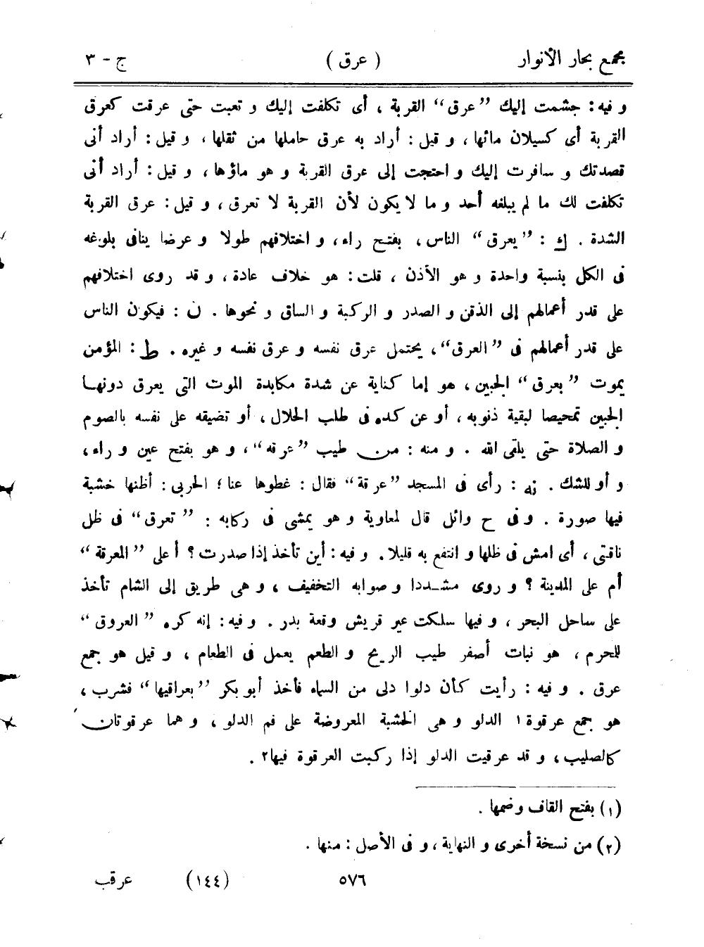 وفيه: جشمت إليك "عرق" القربة، أي تكلفت إليك وتعبت حتى عرقت كعرق القربة أي كسيلان مائها، وقيل: أراد به عرق حاملها من ثقلها، وقيل: أراد أني قصدتك وسافرت إليك واحتجت إلى عرق القربة وهو ماؤها، وقيل: أراد أني تكلفت لك ما لم يبلغه أحد وما لا يكون لأن القربة لا تعرق، وقيل: عرق القربة الشدة. ك: "يعرق" الناس، بفتح راء، واختلافهم طولًا وعرضًا ينافي بلوغه في الكل بنسبة واحدة وهو الأذن، قلت: هو خلاف عادة، وقد روى اختلافهم على قدر أعمالهم إلى الذقن والصدر والركبة والساق ونحوها. ن: فيكون الناس على قدر أعمالهم في "العرق"، يحتمل عرق نفسه وعرق نفسه وغيره. ط: المؤمن يموت "بعرق" الجبين، هو إما كناية عن شدة مكابدة الموت التي يعرق دونها الجبين تمحيصًا لبقية ذنوبه، أو عن كده في طلب الحلال، أو تضيقه على نفسه بالصوم والصلاة حتى يلقى الله. ومنه: من طيب "عرقه"، وهو بفتح عين وراء، وأو للشك. نه: رأى في المسجد "عرقة" فقال: غطوها عنا؛ الحربي: أظنها خشبة فيها صورة. وفي ح وائل قال لمعاوية وهو يمشي في ركابه: "تعرق" في ظل ناقتي، أي امش في ظلها وانتفع به قليلًا. وفيه: أين تأخذ إذا صدرت؟ أعلى "المعرقة" أم على المدينة؟ وروى مشددًا وصوابه التخفيف، وهي طريق إلى الشام تأخذ على ساحل البحر، وفيها سلكت عير قريش وقعة بدر. وفيه: إنه كره "العروق" للمحرم، هو نبات أصفر طيب الريح والطعم يعمل في الطعام، وقيل هو جمع عرق. وفيه: رأيت كأن دلوًا دلى من السماء فأخذ أبو بكر "بعراقيها" فشرب، هو جمع عرقوة الدلو وهي الخشبة المعروضة على فم الدلو، وهما عرقوتان كالصليب، وقد عرقيت الدلو إذا ركبت العرقوة فيها.