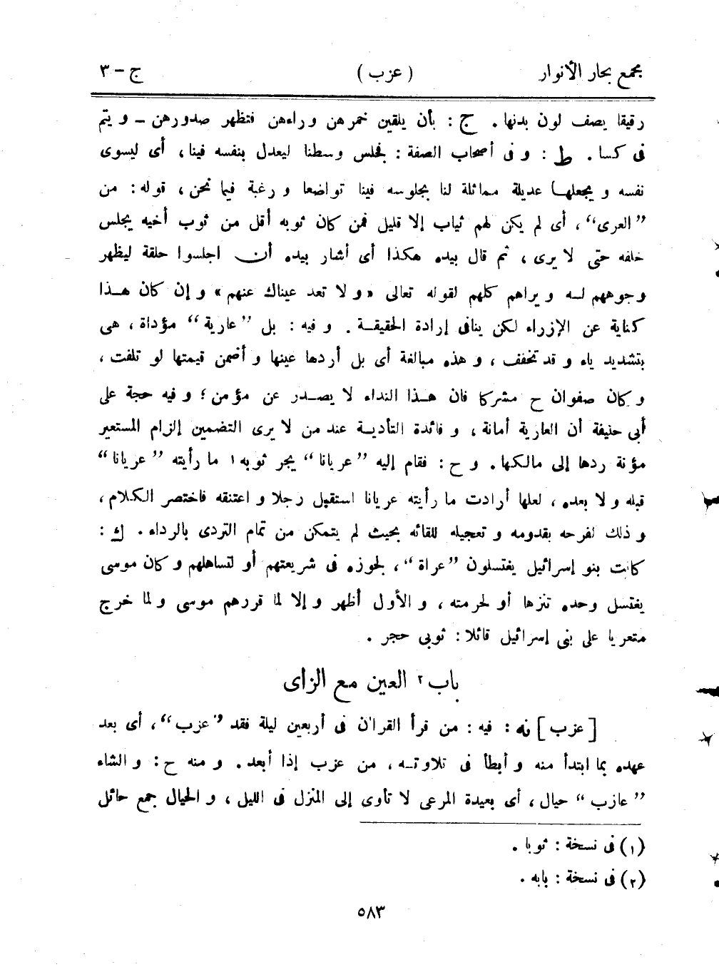 رقيقًا يصف لون بدنها. ج: بأن يلقين خمرهن وراءهن فتظهر صدورهن- ويتم في كسا. ط: وفي أصحاب الصفة: فجلس وسطنا ليعدل بنفسه فينا، أي ليسوي نفسه ويجعلها عديلة مماثلة لنا بجلوسه فينا تواضعًا ورغبة فيما نحن، قوله: من "العري"، أي لم يكن لهم ثياب إلا قليل فمن كان ثوبه أقل من ثوب أخيه يجلس خلفه حتى لا يرى، ثم قال بيده هكذا أي أشار بيده أن اجلسوا حلقة ليظهر وجوههم له ويراهم كلهم لقوله تعالى "ولا تعد عيناك عنهم" وإن كان هذا كناية عن الإزراء لكن ينافي إرادة الحقيقة. وفيه: بل "عارية" مؤداة، هي بتشديد ياء وقد تخفف، وهذه مبالغة أي بل أردها عينها وأضمن قيمتها لو تلفت، وكان صفوان ح مشركًا فإن هذا النداء لا يصدر عن مؤمن؛ وفيه حجة على أبي حنيفة أن العارية أمانة، وفائدة التأدية عند من لا يرى التضمين إلزام المستعير مؤنة ردها إلى مالكها. وح: فقام إليه "عريانًا" يجر ثوبه ما رأيته "عريانًا" قبله ولا بعده، لعلها أرادت ما رأيته عريانًا استقبل رجلًا واعتنقه فاختصر الكلام، وذلك لفرحه بقدومه وتعجيله للقائه بحيث لم يتمكن من تمام التردي بالرداء. ك: كانت بنو إسرائيل يغتسلون "عراة"، لجوزه في شريعتهم أو لتساهلهم وكان موسى يغتسل وحده تنزهًا أول حرمته، والأول أظهر وإلا لما قررهم موسى ولما خرج متعريًا على بني إسرائيل قائلًا: ثوبي حجر.
