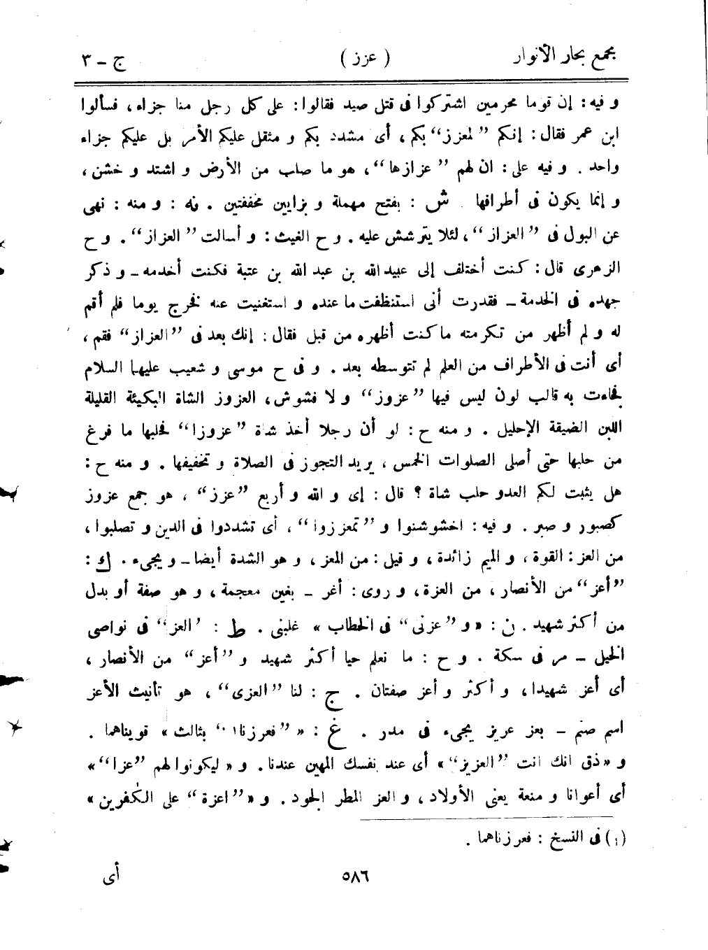 وفيه: إن قومًا محرمين اشتركوا في قتل صيد فقالوا: على كل رجل منا جزاء، فسألوا ابن عمر فقال: إنكم "لمعزز" بكم، أي مشدد بكم ومثقل عليكم الأمر بل عليكم جزاء واحد. وفيه علي: أن لهم "عزازها"، هو ما صلب من الأرض واشتد وخشن، وإنما يكون في أطرافها. ش: بفتح مهملة وبزايين مخففتين. نه: ومنه: نهى عن البول في "العزاز"، لئلا يترشش عليه. وح الغيث: وأسالت "العزاز". وح الزهري قال: كنت أختلف إلى عبيد الله بن عبد الله بن عتبة فكنت أخدمه- وذكر جهده في الخدمة- فقدرت أني استنظفت ما عنده واستغنيت عنه فخرج يومًا فلم أقم له ولم أظهر من تكرمته ما كنت أظهره من قبل فقال: إنك بعد في "العزاز" فقم، أي أنت في الأطراف من العلم لم تتوسطه بعد. وفي ح موسى وشعيب عليهما السلام فجاءت به قالب لون ليس فيها "عزوز" ولا فشوش، العزوز الشاة البكيئة القليلة اللبن الضيقة الإحليل. ومنه ح: لو أن رجلًا أخذ شاة "عزوزًا" فحلبها ما فرغ من حلبها حتى أصلي الصلوات الخمس، يريد التجوز في الصلاة وتخفيفها. ومنه ح: هل يثبت لكم العدو حلب شاة؟ قال: إي والله وأربع "عزز"، هو جمع عزوز كصبور وصبر. وفيه: اخشوشنوا و"تمعززوا"، أي تشددوا في الدين وتصلبوا، من العز: القوة، والميم زائدة، وقيل: من المعز، وهو الشدة أيضًا- ويجيء. ك: "أعز" من الأنصار، من العزة، وروى: أغر- بغين معجمة، وهو صفة أو بدل من أكثر شهيد. ن: "و"عزني" في الخطاب" غلبني. ط: "العز" في نواصي الخيل- مر في سكة. وح: ما نعلم حيا أكثر شهيد و"أعز" من الأنصار، أي أعز شهيدًا، وأكثر وأعز صفتان. ج: لنا "العزى"، هو تأنيث الأعز اسم صنم- بعز عريز يجيء في مدر. غ: ""فعرزنا" بثالث" قويناهما. و"ذق أنك أنت "العزيز"" أي عند نفسك المهين عندنا. و"ليكونوا لهم "عزًا"" أي أعوانًا ومنعة يعني الأولاد، والعز المطر الجود. و""أعزة" على الكافرين"