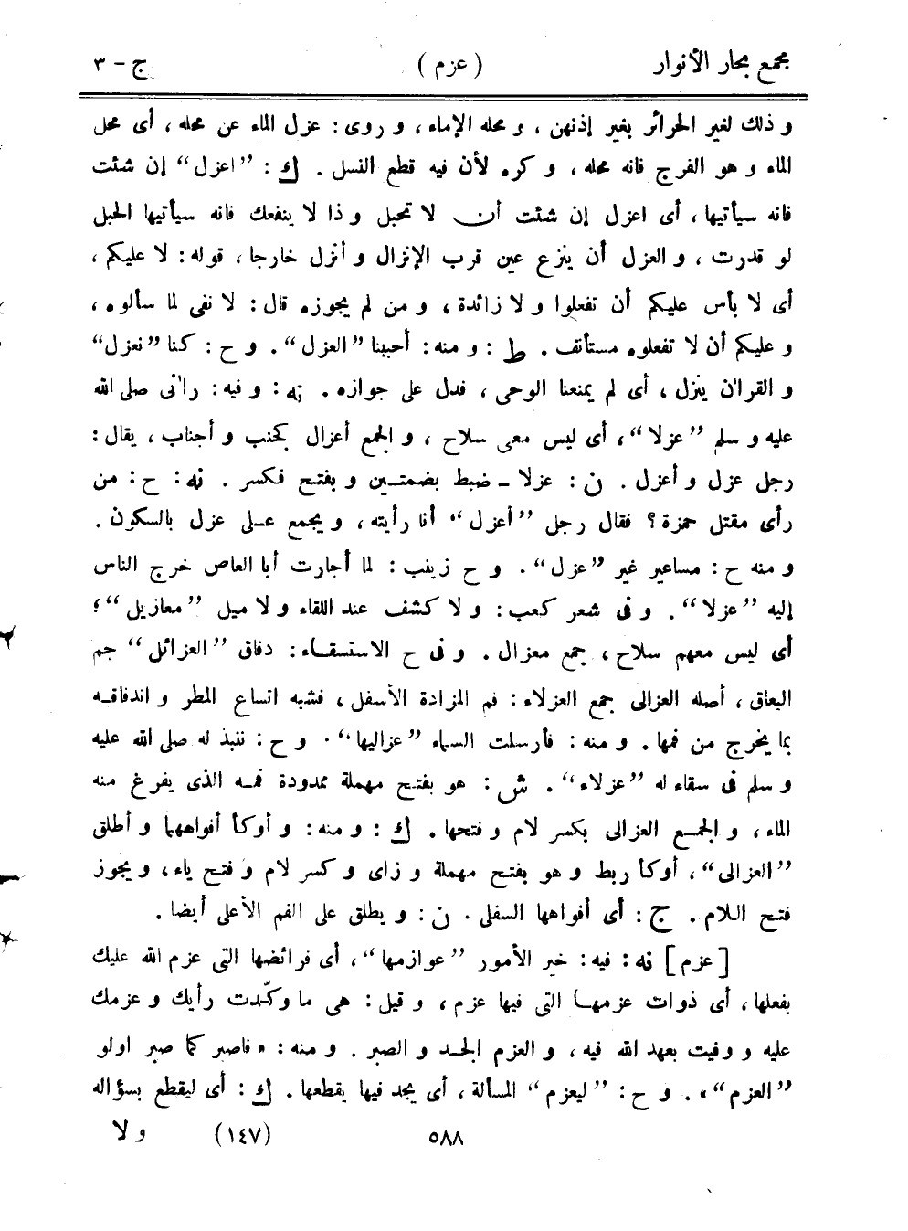 وذلك لغير الحرائر بغير إذنهن، ومحله الإماء، وروى: عزل الماء عن محله، أي محل الماء وهو الفرج فإنه محله، وكره لأن فيه قطع النسل. ك: "اعزل" إن شئت فإنه سيأتيها، أي اعزل إن شئت أن لا تحبل وذا لا ينفعك فإنه سيأتيها الحبل لو قدرت، والعزل أن ينزع عين قرب الإنزال وأنزل خارجًا، قوله: لا عليمك، أي لا بأس عليكم أن تفعلوا ولا زائدة، ومن لم يجوزه قال: لا نفي لما سألوه، وعليكم أن لا تفعلوه مستأنف. ط: ومنه: أحببنا "العزل". وح: كنا "نعزل" والقرآن ينزل، أي لم يمنعنا الوحي، فدل على جوازه. نه: وفيه: رآني صلى الله عليه وسلم "عزلًا"، أي ليس معي سلاح، والجمع أعزال كجنب وأجناب، يقال: رجل عزل وأعزل. ن: عزلًا- ضبط بضمتين وبفتح فكسر. نه: ح: من رأى مقتل حمزة؟ فقال رجل "أعزل" أنا رأيته، ويجمع على عزل بالسكون. ومنه ح: مساعير غير "عزل". وح زينب: لما أجارت أبا العاص خرج الناس إليه "عزلًا". وفي شعر كعب: ولا كشف عند اللقاء ولا ميل "معازيل"؛ أي ليس معهم سلاح، جمع معزال. وفي ح الاستسقاء: دفاق "العزائل" جم البعاق، أصله العزالى جمع العزلاء: فم المزادة الأسفل، فشبه اتساع المطر واندفاقه بما يخرج من فمها. ومنه: فأرسلت السماء "عزاليها". وح: ننبذ له صلى الله عليه وسلم في سقاء له "عزلاء". ش: هو بفتح مهملة ممدودة فمه الذي يفرغ منه الماء، والجمع العزالى بكسر لام وفتحها. ك: ومنه: وأوكأ أفواههما وأطلق "العزالى"، أوكأ ربط وهو بفتح مهملة وزاي وكسر لام وفتح ياء، ويجوز فتح اللام. ج: أي أفواهها السفلى. ن: ويطلق على الفم الأعلى أيضًا.