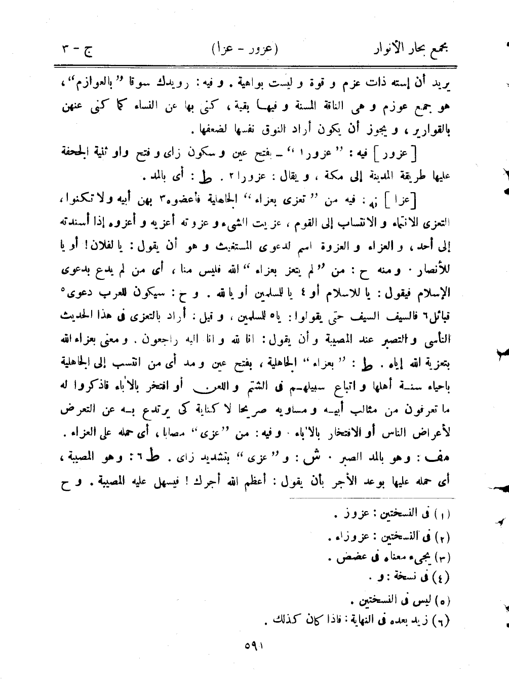 [عزا] نه: فيه من "تعزى بعزاء" الجاهلية فأعضوه بهن أبيه ولا تكنوا، التعزي الانتماء والانتساب إلى القوم، عزيت الشيء وعزوته أعزيه وأعزوه إذا أسندته إلى أحد، والعزاء والعزوة اسم لدعوى المستغيث وهو أن يقول: يا لفلان! أو يا للأنصار. ومنه ح: من "لم يتعز بعزاء" الله فليس منا، أي من لم يدع بدعوى الإسلام فيقول: يا للإسلام أو يا للمسلمين أو يا لله. وح: سيكون للعرب دعوى قبائل فالسيف السيف حتى يقولوا: يا للمسلمين، وقيل: أراد بالتعزي في هذا الحديث التأسي والتصبر عند المصيبة وأن يقول: إنا لله وإنا إليه راجعون، ومعنى بعزاء الله بتعزية الله إياه. ط: "بعزاء" الجاهلية، بفتح عين ومد أي من انتسب إلى الجاهلية بإحياء سنة أهلها وإتباع سبيلهم في الشتم واللعن أو افتخر بالآباء فاذكروا له ما تعرفون من مثالب أبيه ومساويه صريحًا لا كناية كي يرتدع به عن التعرض لأعراض الناس أو الافتخار بالآباء، وفيه: من "عزى" مصابًا، أي حمله على العزاء. مف: وهو بالمد الصبر. ش: و"عزى" بتشديد زاي. ط: وهو المصيبة، أي حمله عليها بوعد الأجر بأن يقول: أعظم الله أجرك! فيسهل عليه المصيبة. وح