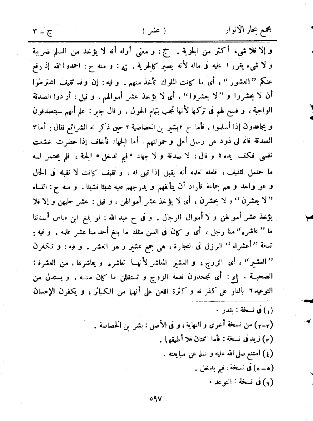 وإلا فلا شيء أكثر من الجزية. ج: ومعنى أوله أنه لا يؤخذ من المسلم ضريبة ولا شيء يقرر عليه في ماله لأنه يصير كالجزية. نه: ومنه ح: احمدوا الله إذ رف عنكم "العشور"، أي ما كانت الملوك تأخذ منهم. وفيه: إن وفد ثقيف اشترطوا أن لا يحشروا و"لا يعشروا"، أي لا يؤخذ عشر أموالهم، وقيل: أرادوا الصدقة الواجبة، وفسح لهم في تركها لأنها تجب بتمام الحول، وقال جابر: علم أنهم سيتصدقون ويجاهدون إذا أسلموا، فأما ح بشير بن الخصاصية حين ذكر له الشرائع فقال: أما الصدقة فإنما لي ذودهن رسل أهلي وحمولتهم، أما الجهاد فأخاف إذا حضرت خشعت نفسي فكف يده وقال: لا صدقة ولا جهاد فبم تدخل الجنة، فلم يحتمل له ما احتمل لثقيف، فلعله لعلمه أنه يقبل إذا قيل له، وثقيف كانت لا تقبله في الحال وهو واحد وهم جماعة فأراد أن يتالفهم ويدرجهم عليه شيئًا فشيئًا. ومنه ح: النساء "لا يعشرن" ولا يحشرن، أي لا يؤخذ عشر أموالهن، وقيلك عشر حليهن وإلا فلا يؤخذ عشر أموالهن ولا أموال الرجال. وفي ح عبد الله: لو بلغ ابن عباس أسناننا ما "عاشره" منا رجل، أي لو كان في السن مثلنا ما بلغ أحد منا عشر علمه. وفيه: تسعة "أعشراء" الرزق في التجارة، هي جمع عشير وهو العشر. وفيه: وتكفرن "العشير"، أي الزوج، والعشير المعاشر لأنها تعاشره ويعاشرها، من العشرة: الصحبة. ك: أي تجحدون نعمة الزوج وتستقللن ما كان منه، ويستدل من التوعيد بالنار على كفرانه وكثرة اللعن على أنهما من الكبائر، ويكفرن الإحسان