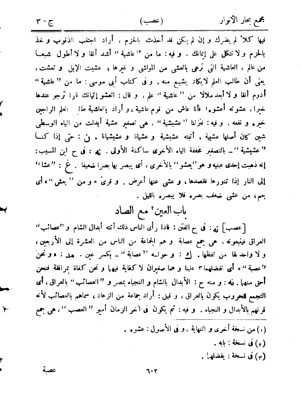 فيها كلأ لم يضرك وإن لم يكن قد أخذت بالحزم، أراد اجتنب الذنوب وخذ بالحزم ولا تتكل على إيمانك. وفيه: ما من "عاشية" أشد أنقًا ولا أطول شبعًا من عالم، العاشية التي ترعى بالعشي من المواشي وغيرها، عشيت الإبل وتعشت، يعني أن طالب العلم لا يكاد يشبع منه. وفي كتاب أبي موسى: ما من "عاشية" أدوم أنقًا ولا أبعد ملالًا من "عاشية" علم، وقال: العشو إتيانك نارًا ترجو عندها خيرًا، عشوته أعشوه فأنا عاش من قمو عاشية، واراد بالعاشية طالب العلم الراجين خيره ونفعه. وفيه: فنزلنا "عشيشية"، هي تصغير عشية أبدلت من الياء الوسطى شين كان أصلها عشيية، أتيته عشيشية وعشيانًا وعشيشيانًا. ن: حتى إذا كنا "عشيشية"- بالتصغير مخففة الياء الأخرى ساكنة الأولى. نه: في ح ابن المسيب: إنه ذهبت إحدى عينيه وهو "يعشو" بالأخرى، أي يبصر بها بصرًا ضعيفًا. غ: "عشا" إلى النار إذا تنورها فقصدها، وعشى عنها أعرض. وقرئ "ومن "يعش"" أي يعم، من عشي ضعف بصره فلا يبصره بالليل.