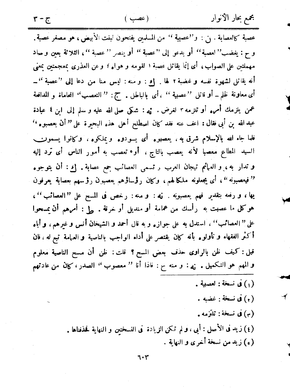 عصبة كالعصابة. ن: و"عصيبة" من المسلمين يفتحون لبنت الأبيض، هو مصغر عصبة. وح: يغضب "لعصبة" أو يدعو إلى "عصبة" أو ينصر "عصبة"، الثلاثة بعين وصاد مهملتين على الصواب، أي إنما يقاتل عصبة لقومه وهواه؛ وعن العذري بمعجمتين بمعنى أنه يقاتل لشهوة نفسه وغضبة لها. ك: ومنه: ليس منا من دعا إلى "عصبة"- أي معاونة ظلم- أو قاتل "عصبية"، أي بالباطل. ج: "التعصب" المحاماة والمدافعة عمن يلزمك أمره أو تلزمه لغرض. نه: شكى صلى الله عليه وسلم إلى ابن عبادة عبد الله بن أبي فقال: اعف عنه فقد كان اصطلح أهل هذه البحيرة على "أن يعصبوه" فلما جاء الله بالإسلام شرق به، يعصبوه أي يسودوه ويملكوه، وكانوا يسمون السيد المطاع معصبًا لأنه يعصب بالتاج، أو تعصب به أمور الناس أي ترد إليه وتدار به، والعمائم تيجان العرب وتسمى العصائب جمع عصابة. ك: أن يتوجوه "فيعصبونه"، أي يجعلونه ملكًا لهم، وكان رؤساؤهم يعصبون رؤسهم بعصابة يعرفون بها، ورفعه بتقدير فهم يعصبونه. نه: ومنه: رخص في المسح على "العصائب"، هو كل ما عصبت به رأسك من عمامة أو منديل أو خرقة. ط: أمرهم أن يمسحوا على "العصائب"، استدل به على جوازه وبه قال أحمد والشيخان أنس وغيرهم، وأباه أكثر الفقهاء وتأولوه بأنه كان يقتصر على أداء الواجب بالناصية والعمامة تبع له، فإن قيل: كيف ظن بالراوي حذف بعض المسح؟ قلت: ظن أن مسح الناصية معلوم والمهم هو التكميل. نه: ومنه ح: فإذا أنا "معصوب" الصدر، كان من عادتهم