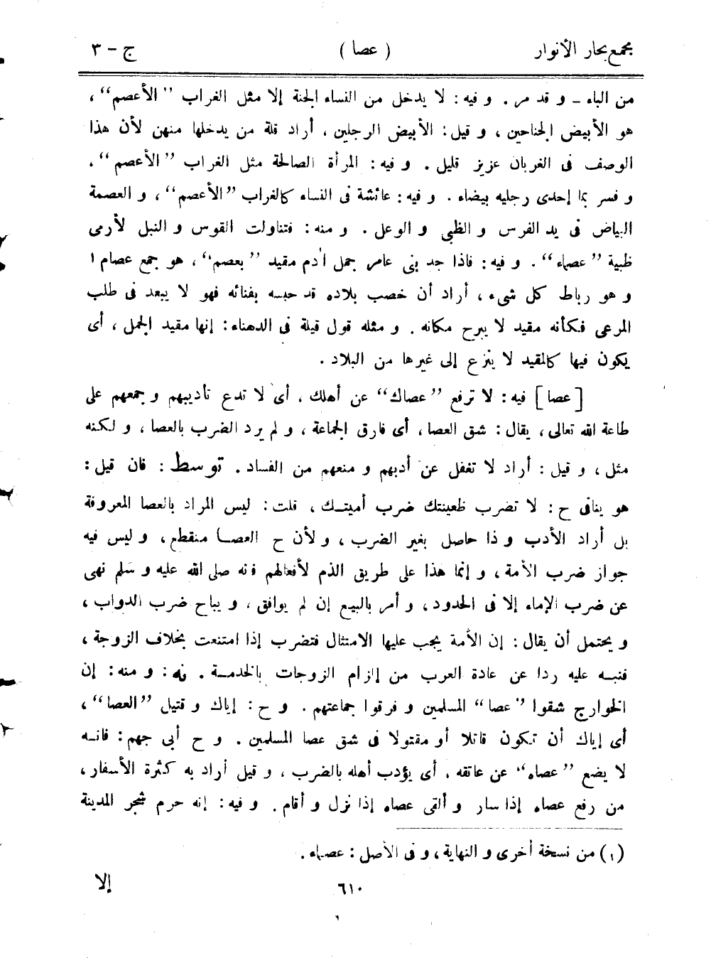 من الباء- وقد مر. وفيه: لا يدخل من النساء الجنة إلا مثل الغراب "الأعصم"، هو الأبيض الجناحين، وقيل، الأبيض الرجلين، أراد قلة من يدخلها منهن لأن هذا الوصف في الغربان عزيز قليل. وفيه: المرأة الصالحة مثل الغراب "الأعصم"، وفسر بما إحدى رجليه بيضاء. وفيه: عائشة في النساء كالغراب "الأعصم"، والعصمة البياض في يد الفرس والظبي والوعل. ومنه: فتناولت القوس والنبل لأرمى ظبية "عصماء". وفيه: فإذا جد بني عامر جمل آدم مقيد طبعصم"، هو جمع عصام وهو رباط كل شيء، أراد أن خصب بلاده قد حبسه بفنائه فهو لا يبعد في طلب المرعى فكأنه مقيد لا يبرح مكانه. ومثله قول قيلة في الدهناء: إنها مقيد الجمل، أي يكون فيها كالمقيد لا ينزع إلى غيرها من البلاد.