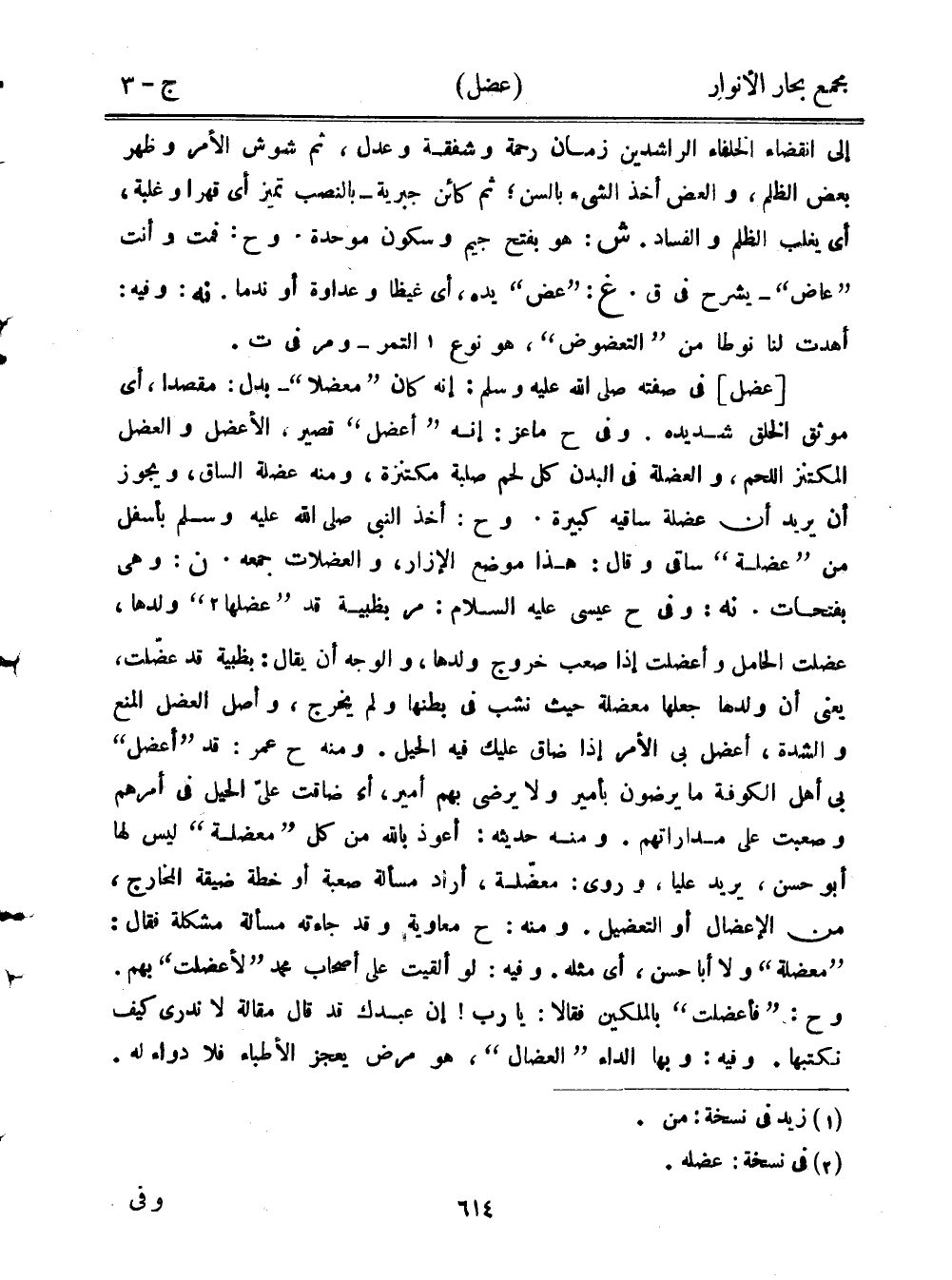 [عضل] في صفته صلى الله عليه وسلم: إنه كان "معضلًا"- بدل: مقصدًا، أي موثق الخلق شديده. وفي ح ماعز: إنه "أعضل" قصير، الأعضل والعضل المكتنز اللحم، والعضلة في البدن كل لحم صلبة مكتنزة، ومنه عضلة الساق، ويجوز أن يريد أن عضلة ساقيه كبيرة. وح: أخذ النبي صلى الله عليه وسلم بأسفل من "عضلة" ساقي وقال: هذا موضع الإزار، والعضلات جمعه. ن: وهي بفتحات. نه: وفي ح عيسى عليه السلام: مر بظبية قد "عضلها" ولدها. عضلت الحامل وأعضلت إذا صعب خروج ولدها، والوجه أن يقال: بظبية قد عضلت، يعني أن ولدها جعلها معضلة حيث نشب في بطنهاولم يخرج، وأصل العضل المنع والشدة، أعضل بي الأمر إذا ضاق عليك فيه الحيل. ومنه ح عمر: قد "أعضل" بي أهل الكوفة ما يرضون بأمير ولا يرضى بهم أمير، أي ضاقت علي الحيل في أمرهم وصعبت على مداراتهم. ومنه حديثه: أعوذ بالله من كل "معضلة" ليس لها أبو حسن، يريد عليا، وروى: معضلة، أراد مسألة صعبة أو خطة ضيقة المخارج، من الإعضال أو التعضيل. ومنه: ح معاوية وقد جاءته مسألة مشكلة فقال: "معضلة" ولا أبا حسن، أي مثله. وفيه: لو ألقيت على اصحاب محمد "لأعضلت" بهم. وح: "فأعضلت" بالملكين فقالا: يا رب! إن عبدك قد قال مقالة لا ندري كيف نكتبها. وفيه: وبها الداء "العضال"، هو مرض يعجز الأطباء فلا دواء له.