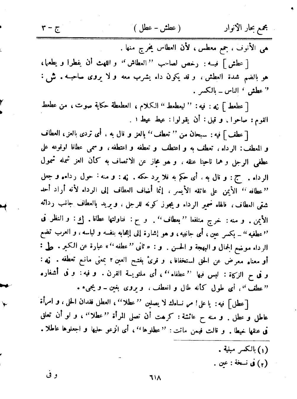 [عطف] فيه: سبحان من "تعطف" بالعز وقال به، أي تردى بالعز، العطاف والمعطف: الرداء، تعطف به واعتطف وتعطفه واعتطفه، وسمي عطافًا لوقوعه على عطفى الرجل وهما ناحيتا عنقه، وهو مجاز عن الاتصاف به كأن العز شمله شمول الرداء. ج: وقال به، أي حكم به فلا يرد حكمه. نه: ومنه: حول رداءه وجعل "عطافه" الأيمن على عاتقه الأيسر، إنما أضاف العطاف إلى الرداء لأنه أراد أحد شقي العطاف، فالهاء ضمير الرداء ويجوز كونه للرجل، ويريد بالعطاف جانب ردائه الأيمن. ومنه: خرج متلفعًا "بعطاف". وح: فناولتها عطافًا. ك: والنظر في "عطفيه"- بكسر عين، أي جانبيه، وهو إشارة إلى إعجابه بنفسه ولباسه، والعرب تضع الرداء موضع الجمال والبهجة والحسن. و: "ثاني "عطفه"" عبارة عن الكبر. ط: أو معناه معرض عن الحق استخفافًا، وقرئ بفتح العين بمعنى مانع تعطفه. نه: وفي ح الزكاة: ليس فيها "عطفاء"، أي ملتوية القرن. وفيه: وفي أشفاره "عطف"، أي طول كأنه طال وانعطف، ويروى بغين- ويجيء.