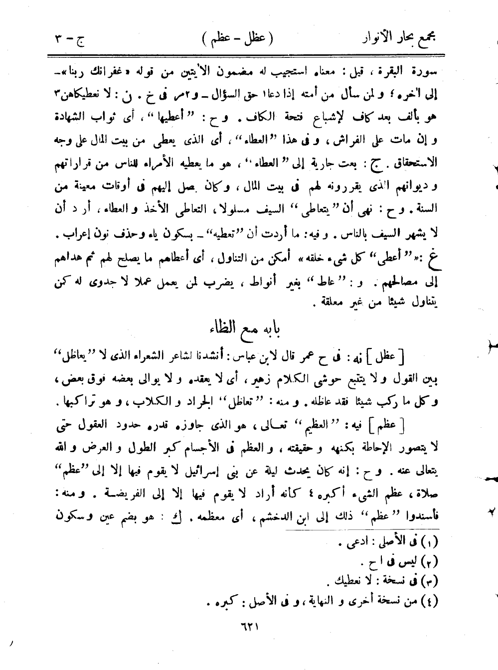 سورة البقرة، قيل: معناه استجيب له مضمون الآيتين من قوله "غفرانك ربنا"- إلى آخره؛ ولمن سأل من أمته إذا دعا حق السؤال- ومر في خ. ن: لا نعطيكاهن هو بألف بعد كاف لإشباع فتح الكاف. وح: "أعطيها"، أي ثواب الشهادة وإن مات على الفراش، وفي هذا "العطاء"، أي الذي يعطي من بيت المال على وجه الاستحقاق. ج: بعت جارية إلى "العطاء"، هو ما يعطيه الأمراء للناس من قراراتهم وديوانهم الذي يقررونه لهم في بيت المال، وكان يصل إليهم في أوقات معينة من السنة. وح: نهى أن "يتعاطى" السيف مسلولًا، التعاطي الأخذ والعطاء، أرد أن لا يشهر السيف بالناس. وفيه: ما أردت أن "تعطيه"- بسكون ياء وحذف نون إعراب. غ: ""أعطى" كل شيء خلقه" أمكن من التناول، أي أعطاهم ما يصلح لهم ثم هداهم إلى مصالحهم. و: "عاط" بغير أنواط، يضرب لمن يعمل عملًا لا جدوى له كمن يتناول شيئًا من غير معلقة.
