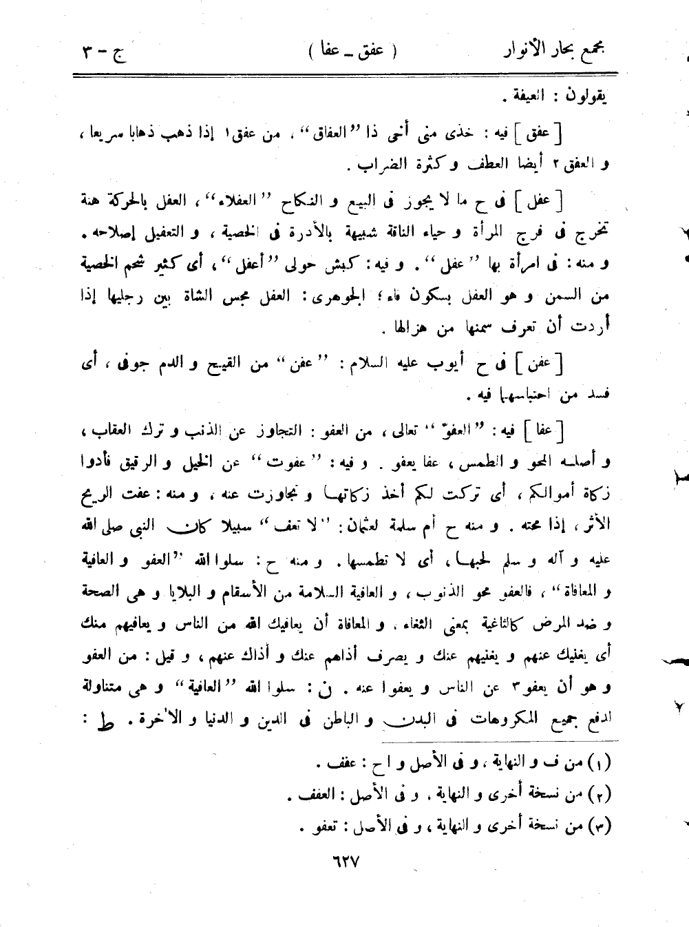 [عفا] فيه: "العفو" تعالى، من العفو: التجاوز عن الذنب وترك العقاب، وأصله المحو والطمس، عفا يعفو. وفيه: "عفوت" عن الخيل والرقيق فأدوا زكاة أموالكم، أي تركت لكم أخذ زكاتها وتجاوزت عنه، ومنه: عفت الريح الأثر، إذا محته. ومنه ح أم سلمة لعثمان: "لا تعف" سبيلًا كان النبي صلى الله عليه وآله وسلم لحبها، أي لا تطمسها. ومنه ح: سلوا الله "العفو والعافية والمعافاة"، فالعفو محو الذنوب، والعافية السلامة من الأسقام والبلايا وهي الصحة وضد المرض كالثاغية بمعنى الثغاء، والمعافاة أن يعافيك الله من الناس ويعافيهم منك أي يغنيك عنهم ويغنيهم عنك ويصرف أذاهم عنك وأذاك عنهم، وقيل: من العفو وهو أن يعفو عن الناس ويعفوا عنه. ن: سلوا الله "العافية" وهي متناولة لدفع جميع المكروهات في البدن والباطن في الدين والدنيا والآخرة. ط: