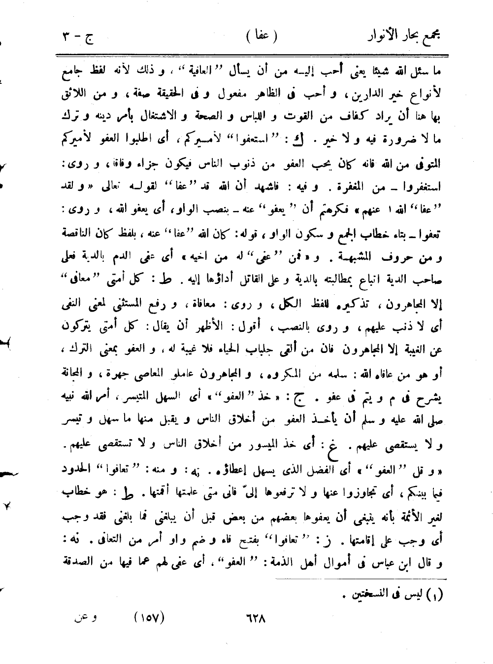 ما سئل الله شيئًا يعني أحب إليه من أن يسأل "العافية"، وذلك لأنه لفظ جامع لأنواع خير الدارين، وأحب في الظاهر مفعول وفي الحقيقة صفة، ومن اللائق بها هنا أن يراد كفاف من القوت واللباس والصحة والاشتغال بأمر دينه وترك ما لا ضرورة فيه ولا خير. ك: "استعفوا" لأميركم، أي اطلبوا العفو لأميركم المتوفى من الله فإنه كان يحب العفو من ذنوب الناس فيكون جزاء وفاقًا، وروى: استغفروا- من المغفرة. وفيه: فاشهد أن الله قد "عفا" لقوله تعالى "ولقد "عفا" الله عنهم" فكرهتم أن "يعفو" عنه- بنصب الواو، أي يعفو الله، وروى: تعفوا- بتاء خطاب الجمع وسكون الواو، قوله: كان الله "عفا" عنه، بلفظ كان الناقصة ومن حروف املشبهة. و"فمن "عفي" له من أخيه" أي عفى الدم بالدية فعلى صاحب الدية إتباع بمطالبته بالدية وعلى القاتل أداؤها إليه. ط: كل أمتي "معافى" إلا المجاهرون، تذكيره للفظ الكل، وروى: معافاة، ورفع المستثنى لمعنى النفي أي لا ذنب عليهم، وروى بالنصب، أقول: الأظهر أن يقال: كل أمتي يتركون عن الغيبة إلا المجاهرون فإن من ألقى جلباب الحياء فلا غيبة له، والعفو بمعنى الترك، أو هو من عافاه الله: سلمه من المكروه، والمجاهرون عاملو المعاصي جهرة، والمجانة يشرح في م ويتم في عفو. ج: "خذ "العفو"" أي السهل المتيسر، أمر الله نبيه صلى الله عليه وسلم أن يأخذ العفو من أخلاق الناس ولا تستقصي عليهم. "وقل "العفو"" أي الفضل الذي يسهل إعطاؤه. نه: ومنه: "تعافوا" الحدود فيما بينكم، أي تجاوزوا عنها ولا ترفعوها إلي فإني متى علمتها أقمتها. ط: هو خطاب لغير الأئمة بأنه ينبغي أن يعفوها بعضهم من بعض قبل أن يبلغني فما بلغني فقد وجب أي وجب على إقامتها. ز: "تعافوا" بفتح فاء وضم واو أمر من التعافي. نه: وقال ابن عباس في أموال أهل الذمة: "العفو"، أي عفى لهم عما فيها من الصدقة
